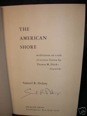Today on ebay, I purchased the following book from a “Buy It Now” auction: “THE AMERICAN SHORE (Dragon Press, 1978, first trade edition). Author: SAMUEL R. DELANY. Fine copy with reinforced binding and without dust jacket, as issued. SIGNED. According to Lloyd Currey, there were 949 trade copies and 100 numbered copies signed by Delany.”
