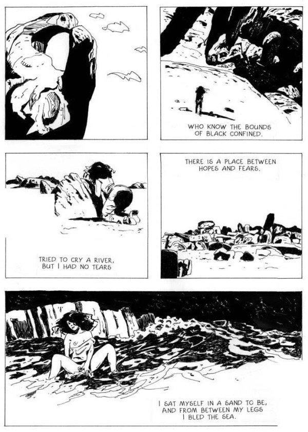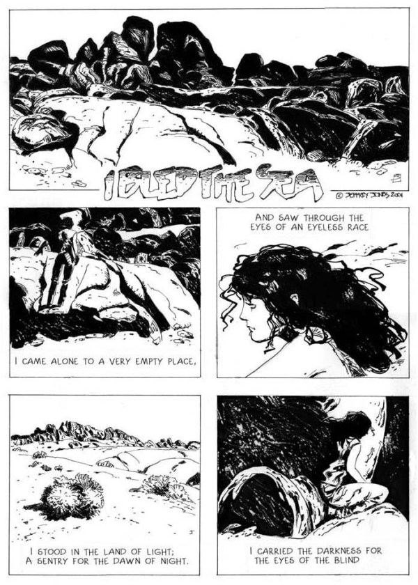 Jeffrey Catherine Jones: That’s kind of like Sophie’s Choice. I really couldn’t tell you. Hopefully the ideal situation is the last one you did. (Smiles.) Of comics work, four years ago I wrote and drew I Bled the Sea that I like. It’s black and white. I don’t like color on drawing. Black and white has a strength to it, an abstractive quality about it that allows the viewer to use his imagination. When I do an ink drawing, it’s black and white.