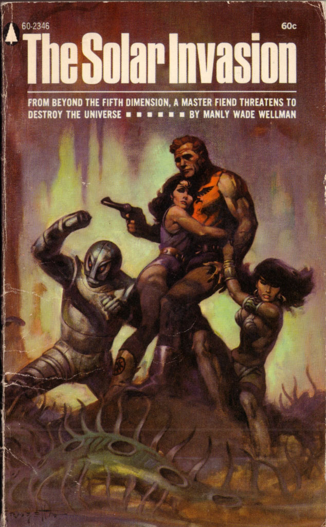 What do I mean when I say that the cover of The Solar Invasion — which I stumbled across by chance this morning at a local shop that sells used books (and purchased to scan for this site) — is “obscure”? What I mean is that the image below has only been reprinted, at small scale, on a left-hand page, in one of the many books on Frank Frazetta’s art. It’s easy to overlook, but if you turn to page 166 in Legacy: Selected Drawings & Paintings by Frank Frazetta (Underwood Books, 1999), you’ll see this (sans typography):
