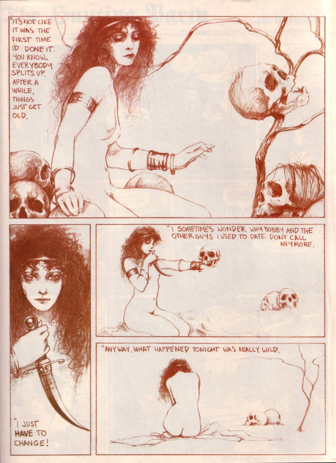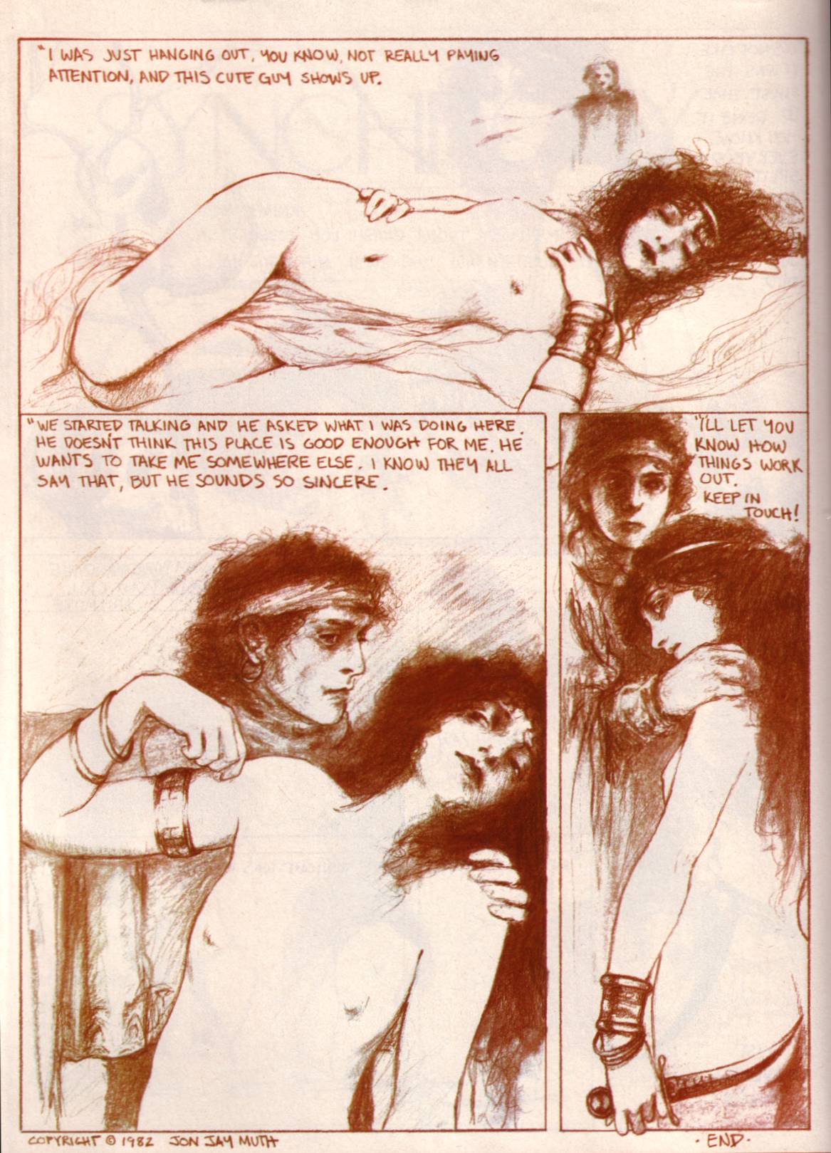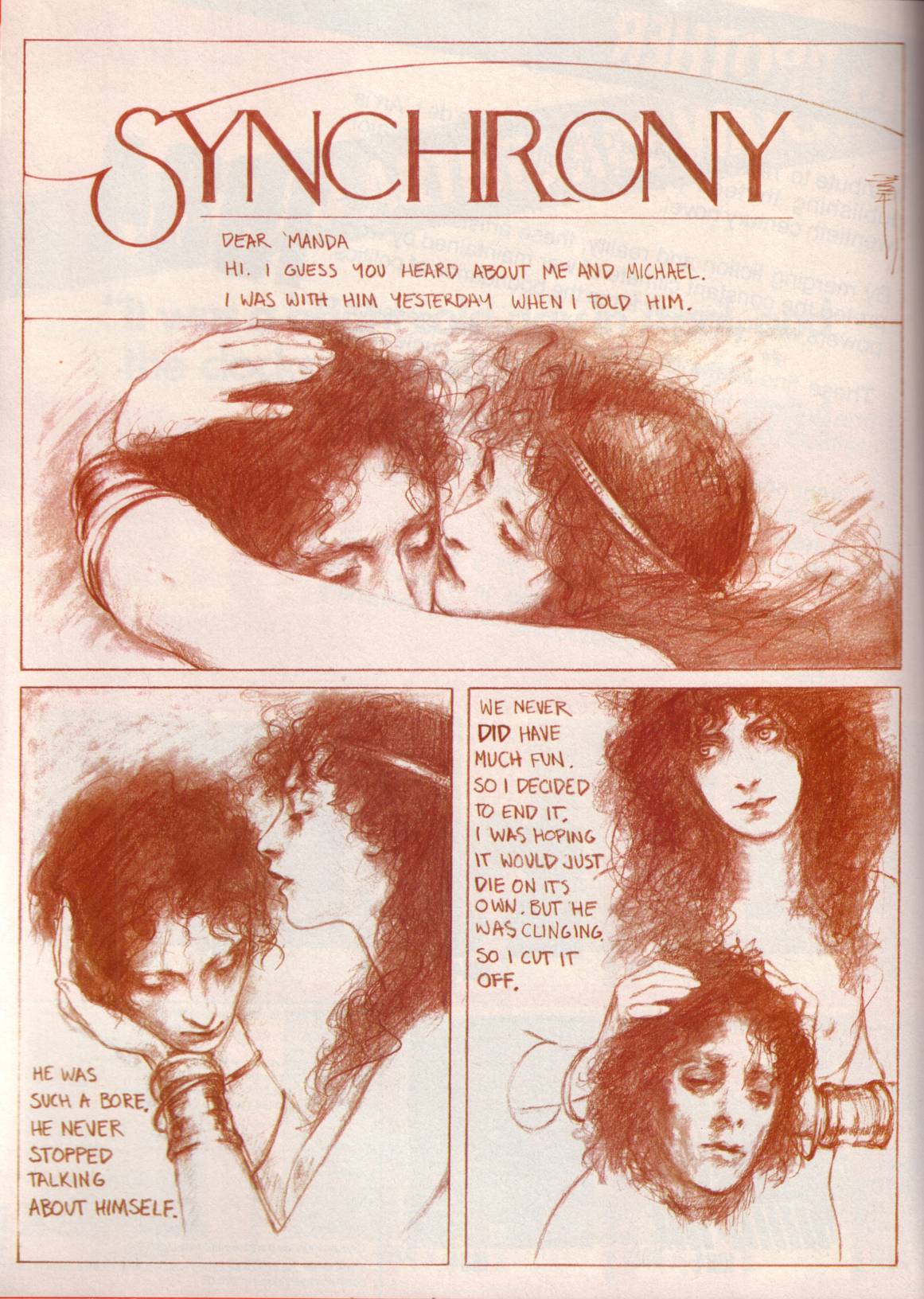 * If I had to guess, I would say that comic artist and illustrator, Barry Windsor-Smith, who has drawn and painted numerous pictures over the years of historical and mythological women holding, fondling, and kissing the severed heads of young men, and who was himself a prominent member of the “New Romantic Brotherhood” of the late 1970s and early 1980s, was also a proximate influence on “Synchrony.”