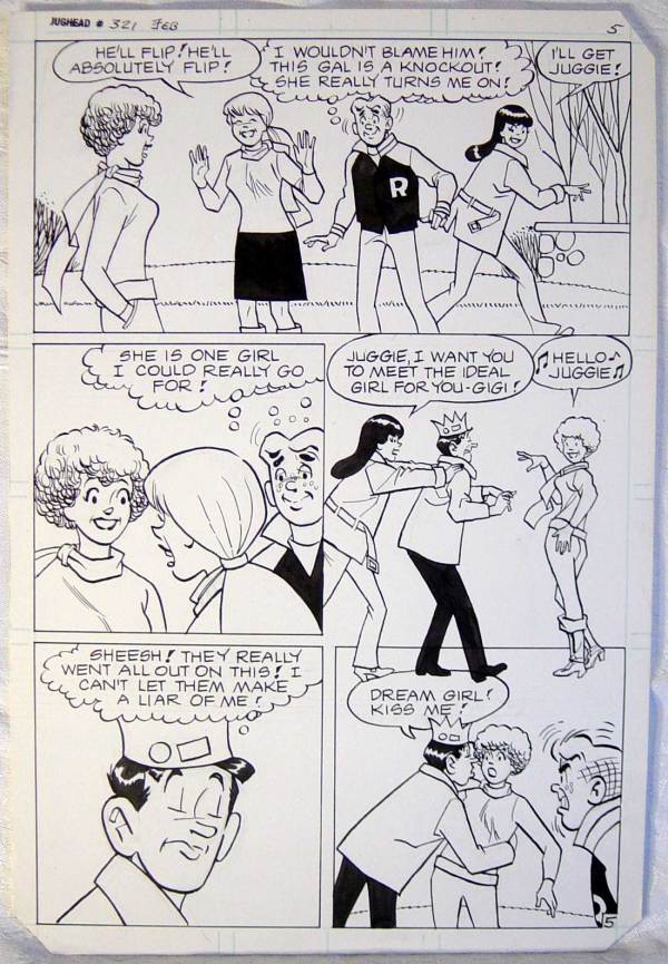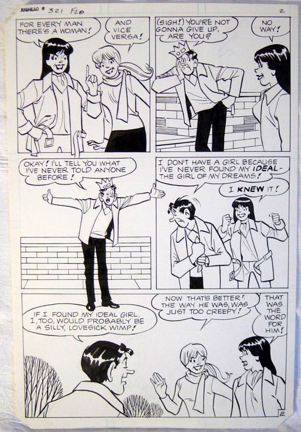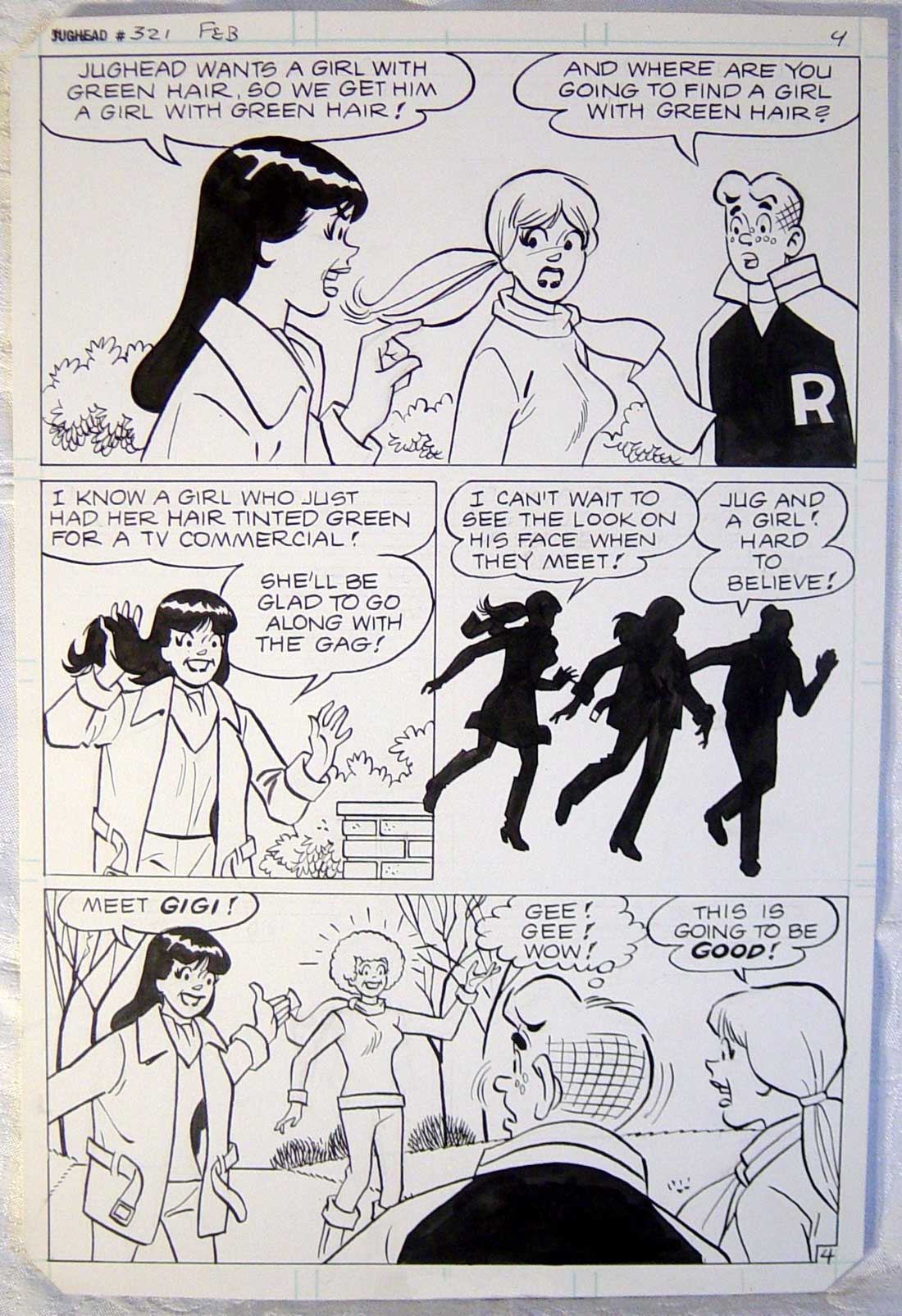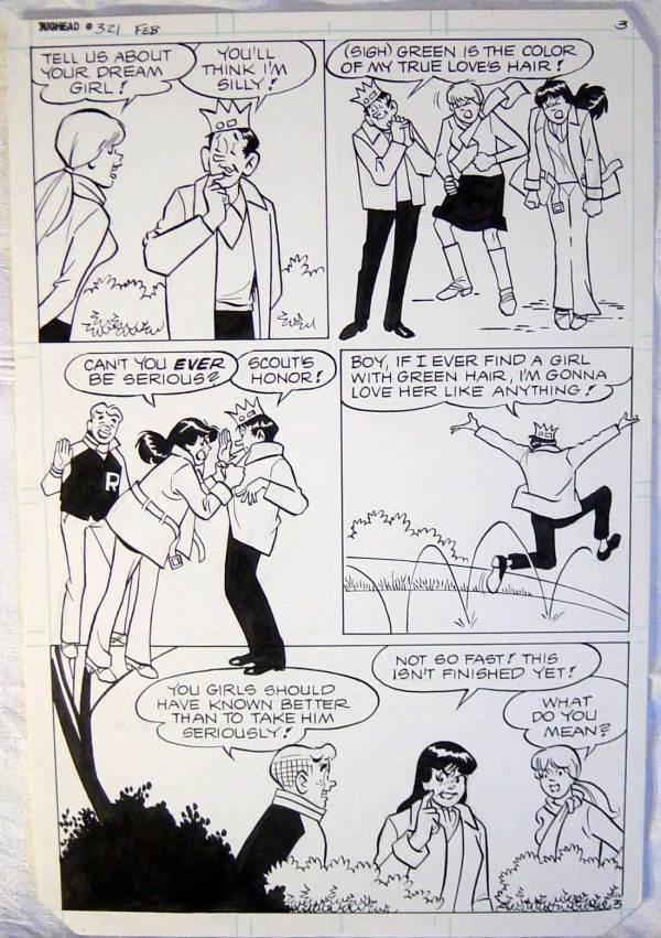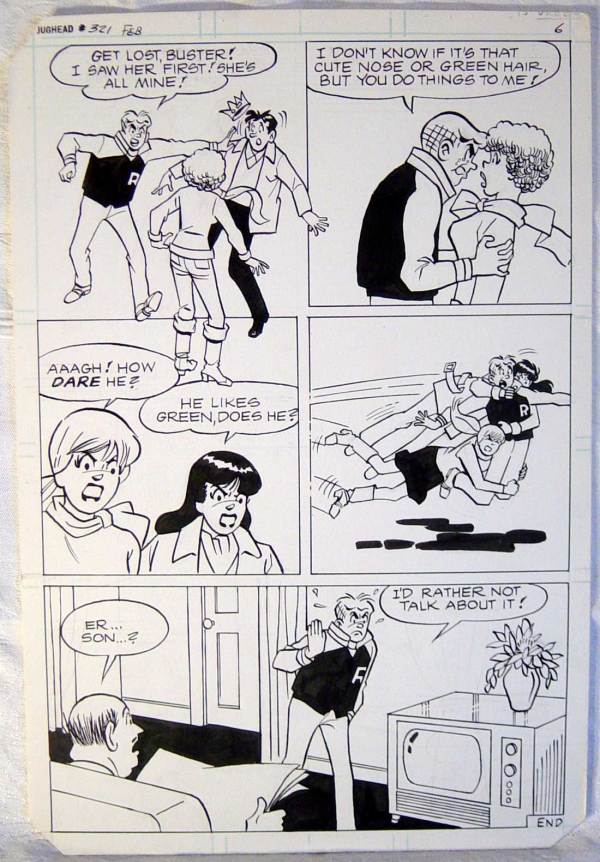 Here’s another selection from our stash of original comic art. It’s a complete short story from Jughead #321, with art by Samm Schwartz. My apologies in advance for the quality of the images; they were shot with an older digital camera under conditions that I ought to have controlled more carefully than I did.