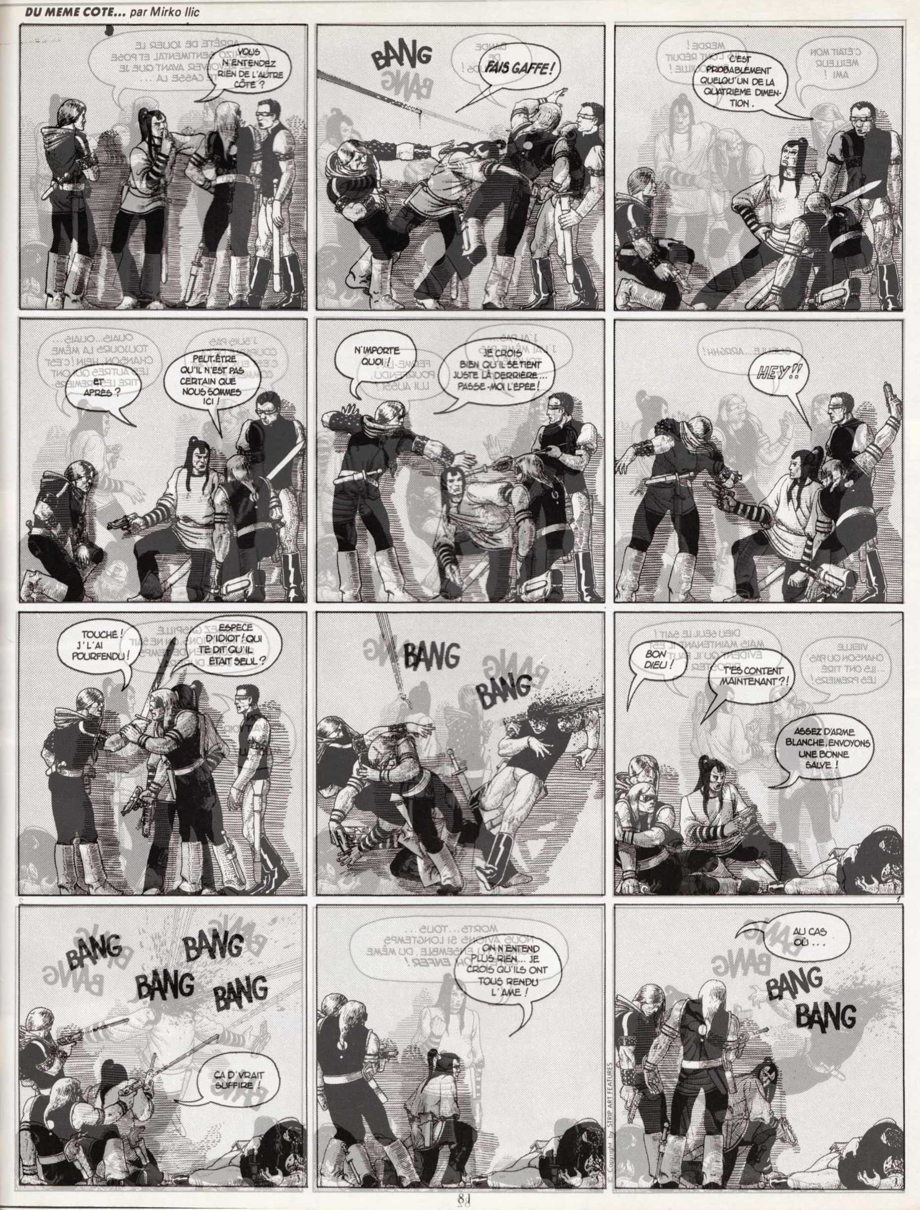 “Du Même Côté” (“On the Same Side”) by Mirko Ilić was published in Métal Hurlant #57 (November 1980), pp. 81-82, with the two pages that comprise the story printed back-to-back on the same leaf. Here’s what you would have seen if you had read the story thinking it was the usual comics fare: