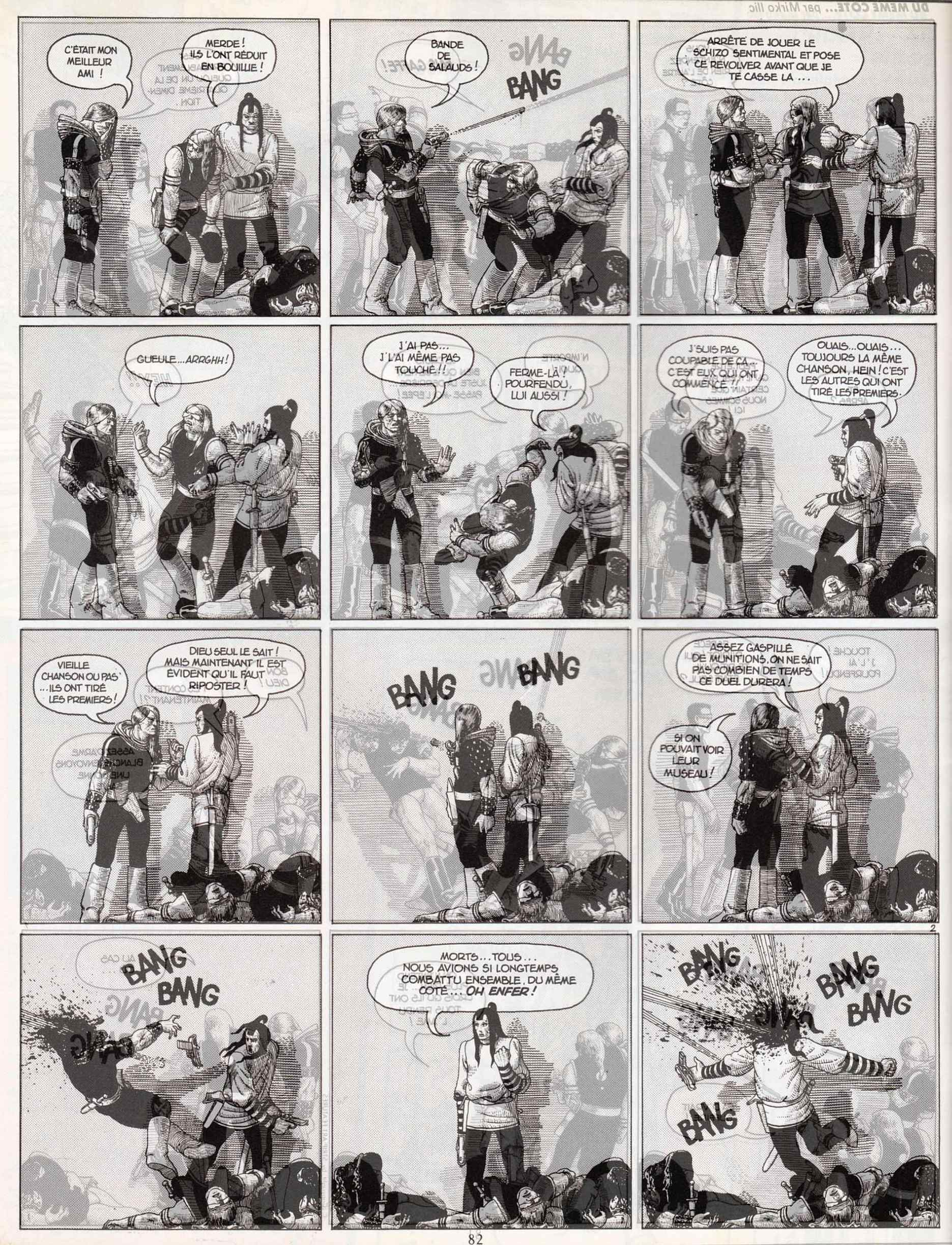 Not surprisingly, it was the above description that prompted me to hunt down a copy of Métal Hurlant #57 so I could present “Du Même Côté” here for your, and my, reading enjoyment. And though it cost me a few bucks — 8.25 EUR, to be exact — I think it was worth it. But then again, I have a real soft spot for black humour and bleak endings.
