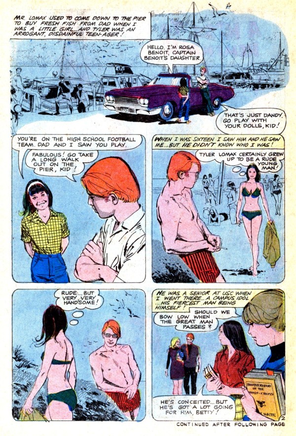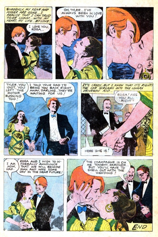 From the Charlton romance comic, Time for Love #18 (September 1970), here’s “A Kiss to Remember” with uncredited but signed comic art by Spanish artist, José Luis García-López, who was only about 22 years old at the time but was undoubtedly already turning the heads of American comics editors and readers alike with an attractive, naturalistic fine-line style that aficionados would immediately have recognized as falling squarely within the Alex Raymond/Leonard Starr/Stan Drake school of comics photorealism:
