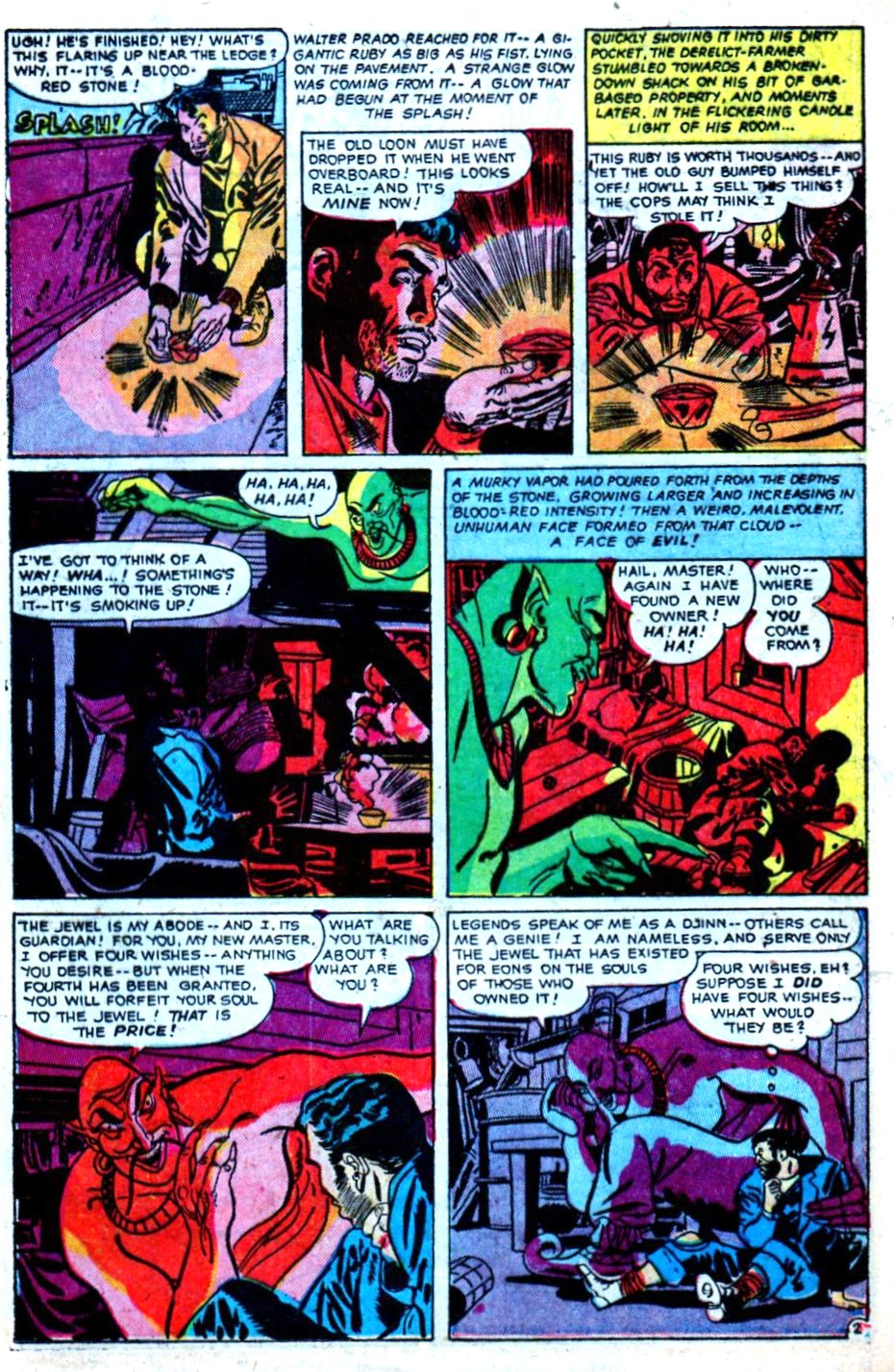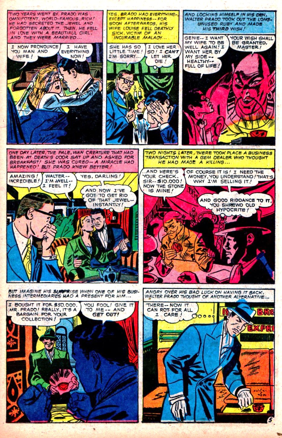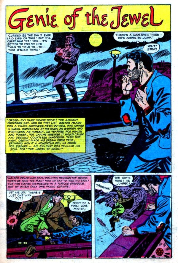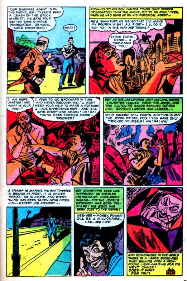 From Web of Mystery #8 (April 1952), here’s “Genie of the Jewel,” with art by Louis Zansky: