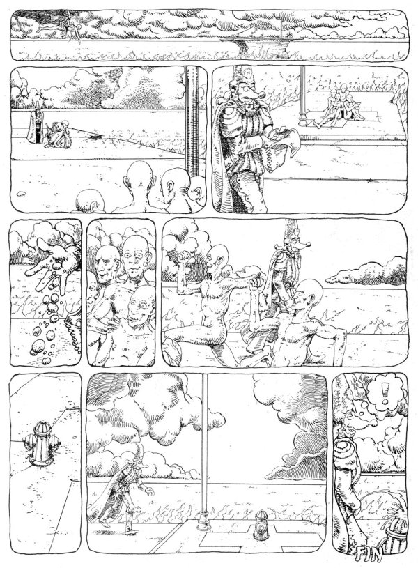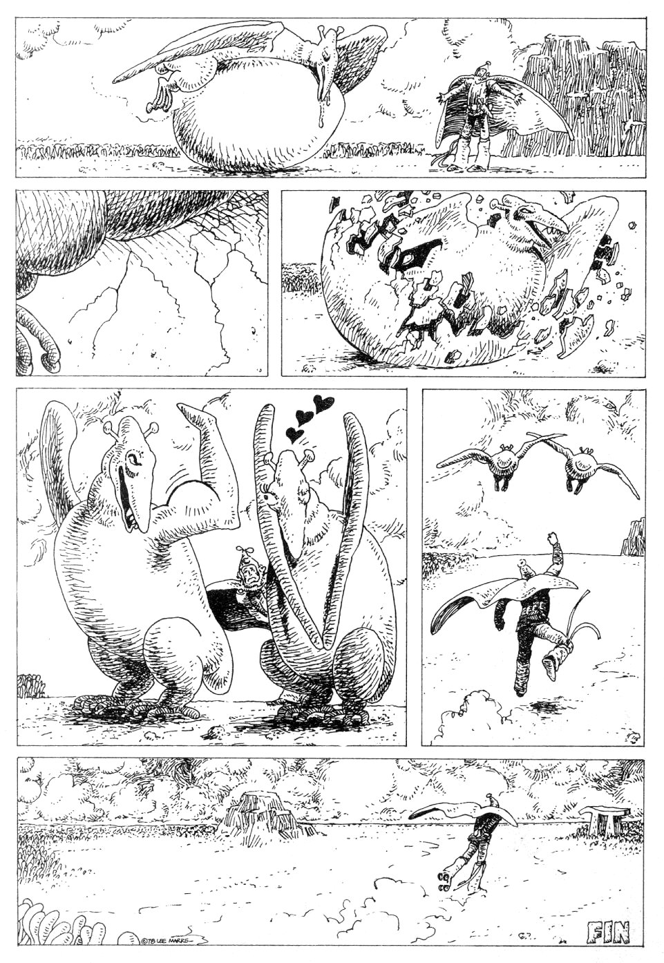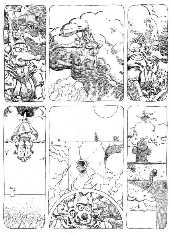 2. The biggest problem with that parody is that the design of Houndzak’s face makes him look more like a rat-man than a dog-man. But the idea that Houndzak is flying around looking for a hydrant to urinate on is a reference back to Moebius’s story “Harzack,” which I posted earlier here at RCN, isn’t it? The artist didn’t just pull the situation out of thin air…