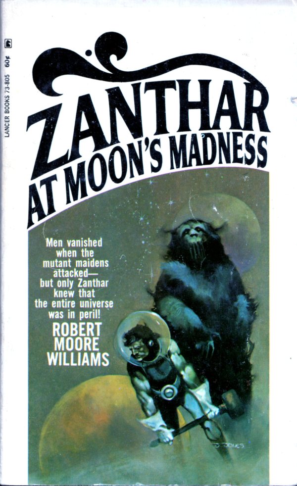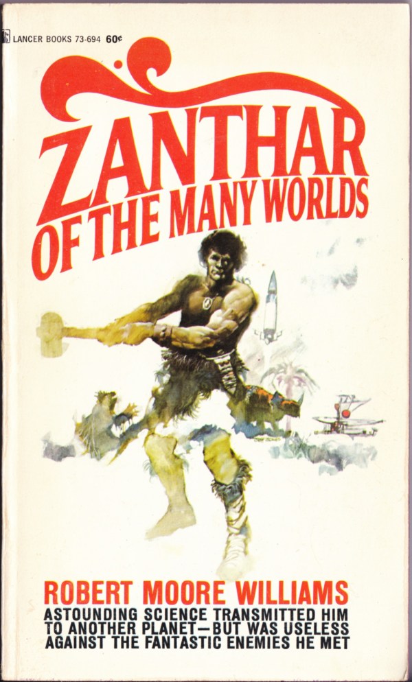 There were four books in the “Zanthar” series by Robert Moore Williams — Zanthar of the Many Worlds (1967), Zanthar at the Edge of Never (1968), Zanthar at Moon’s Madness (1968) and Zanthar at Trip’s End (1969) — but as far as I can determine, only the first, third, and fourth volumes had cover art by Jeffrey Jones. I’ve posted two of Jones’s “Zanthar” covers previously on RCN at a smaller size; now here are all three covers, re-scanned where necessary, and displayed in order of publication: