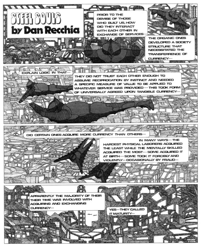 The first two instalments of Dan Recchia’s one-page strip, “Steel Souls,” featured below were published in Hot Stuf’ #6 (1977); the third was published in Hot Stuf’ #7 (1978); and the fourth was published in Jasia Reichardt, Robots: Fact, Fiction, and Prediction (Penguin Books, 1978).