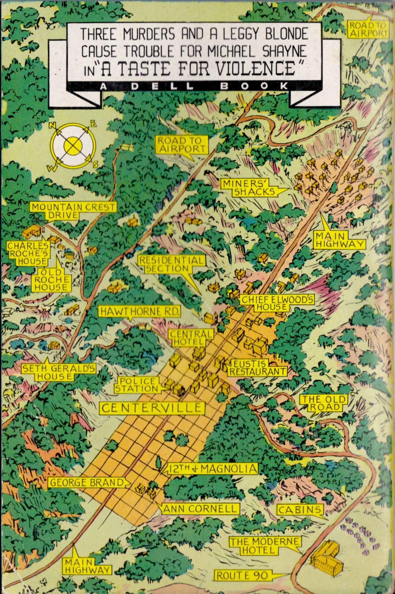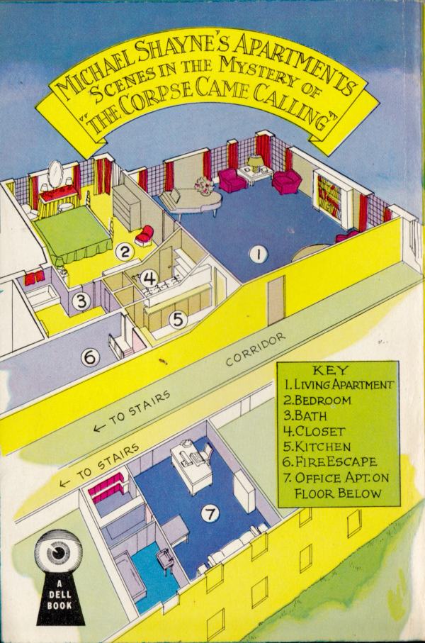 The diagrams on the backs of the novels are not something I personally tend to associate with mystery fiction — fantasy fiction, on the other hand, seems to me to be head-over-heels in love with maps and really ought to marry them — but I do wonder if readers at the time ever actually consulted the back covers as they were reading. The disappearance of the maps and floor plans from later editions of the novels may be a sign that they were not a big selling point, that punchy, suggestive copy did more to whet the reader’s appetite for the story within than a label-festooned diagram of an apartment or a neighbourhood ever could.