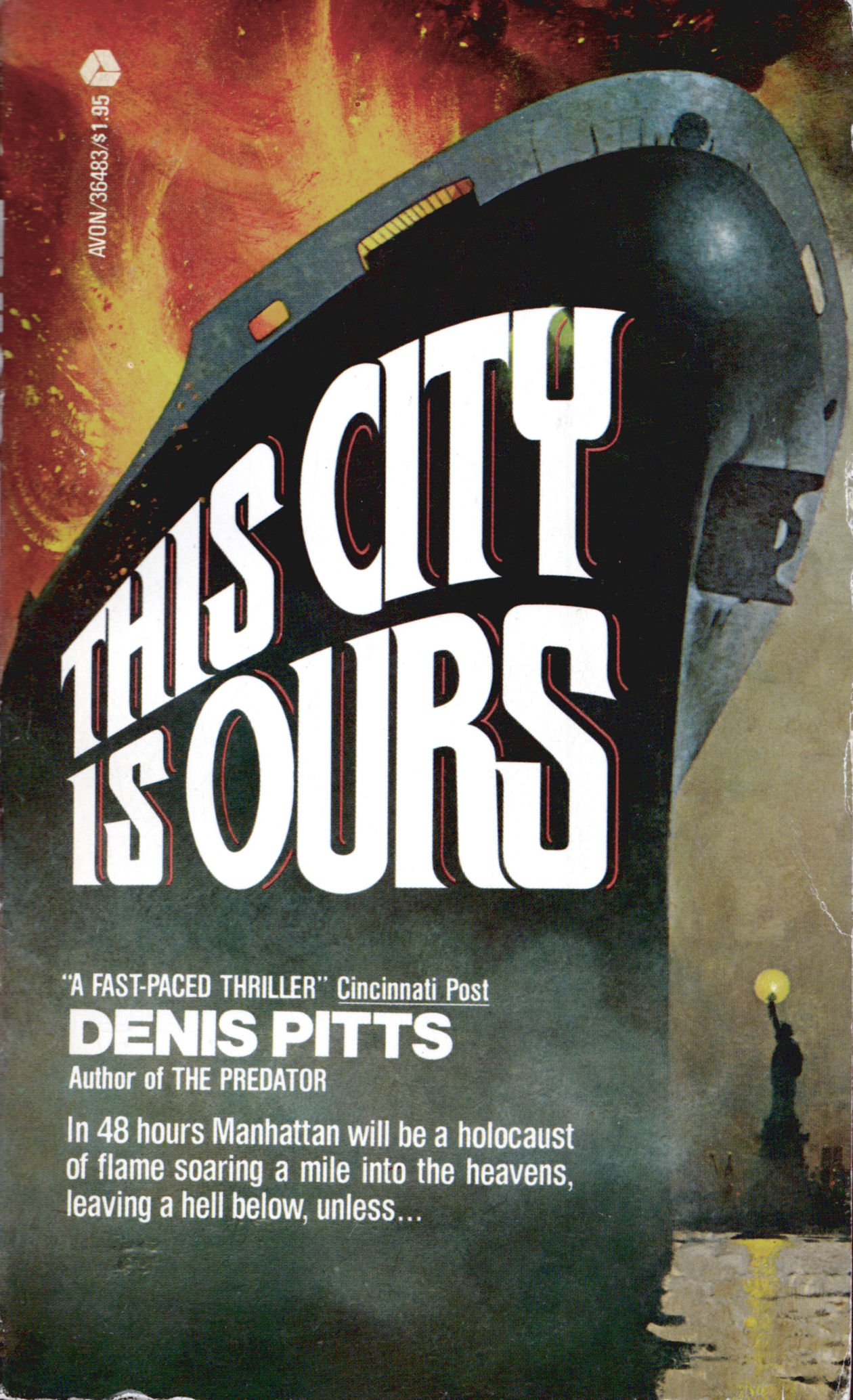 A dramatic illustration (by an uncredited artist) and a bold, complementary title treatment (by an uncredited designer) combine to lift the overall design of the cover of Denis Pitts’ thriller novel from the late 1970s about a terrorist threat to Manhattan to a very high level: