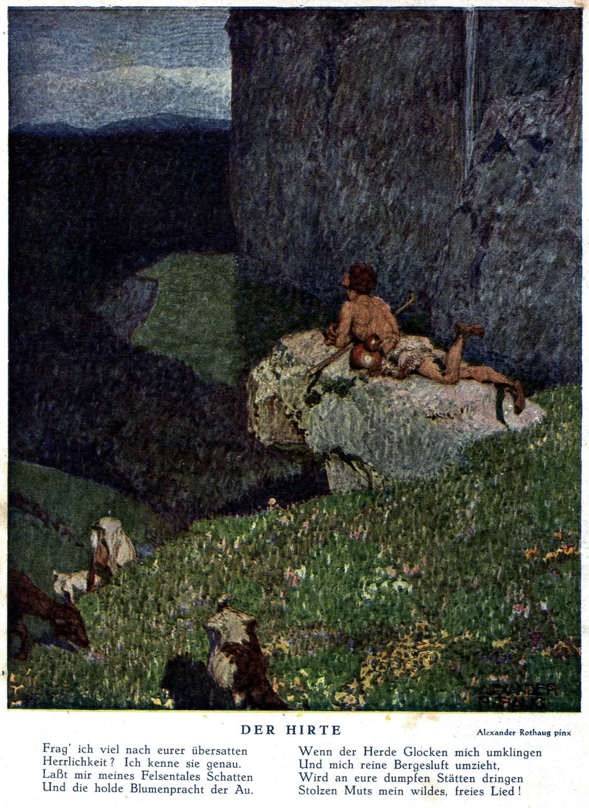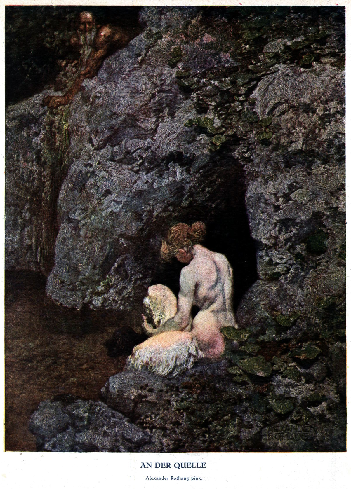 This morning, I’ve decided to bring you further selections from the Austrian humour/men’s magazine, Die Muskete. The artist this time around is Alexander Rothaug (1870 – 1846), who studied painting at the Vienna Academy of Arts from 1885 to 1892, pursued further studies in Munich, where he produced illustrations for the German magazine, Fliegenden Blätter, and then moved back to Vienna, where he worked as a freelance artist from 1897, becoming a member of the Association of the Visual Artists Vienna in 1911; the paintings, which I have extracted from the online archive of Die Muskete hosted by the Austrian National Library and have processed for display here at RCN, are At the Source, Dreaming, and The Herdsman:
