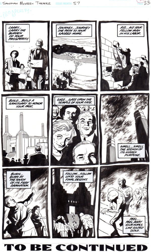 The script here is by Steven T. Seagle, from a story idea by Matt Wagner, the penciller is Michael Lark, the inker is Richard Case, and the letterer is John Costanza. The page was published in Sandman Mystery Theatre #57 (December 1997). The magnificent edifice that the people construct and then are consumed by is a doppelganger of the Battersea Power Station, which was constructed in two stages beginning in 1929 and decommissioned in two stages in the mid 1970s and early 1980s: