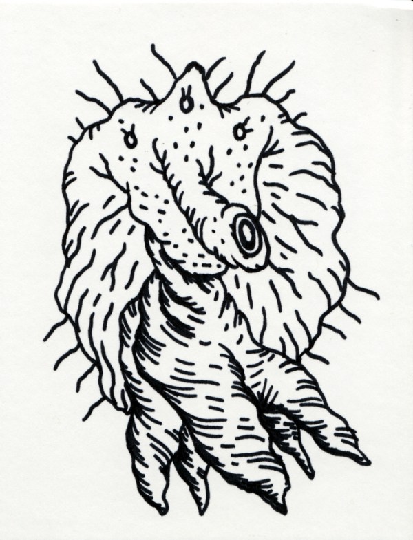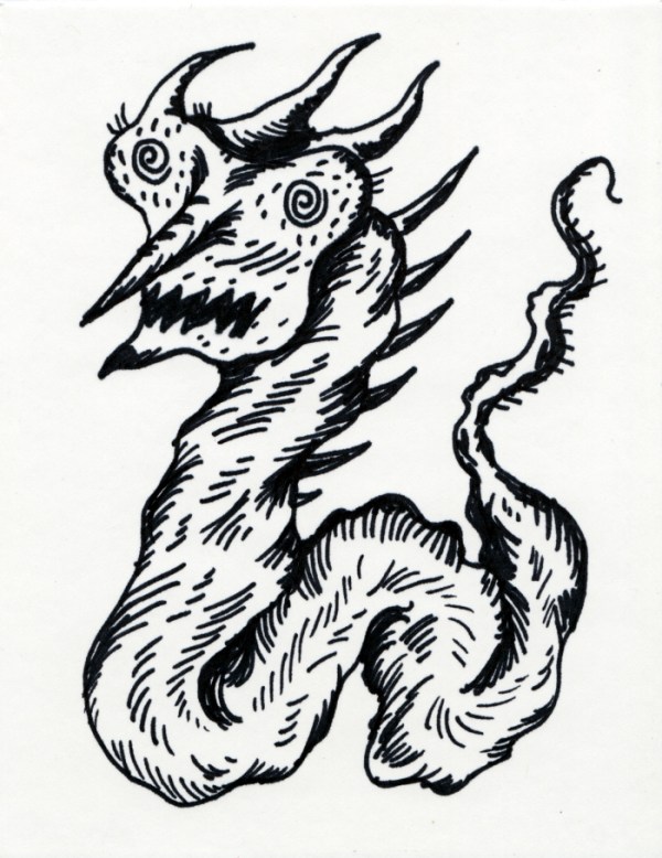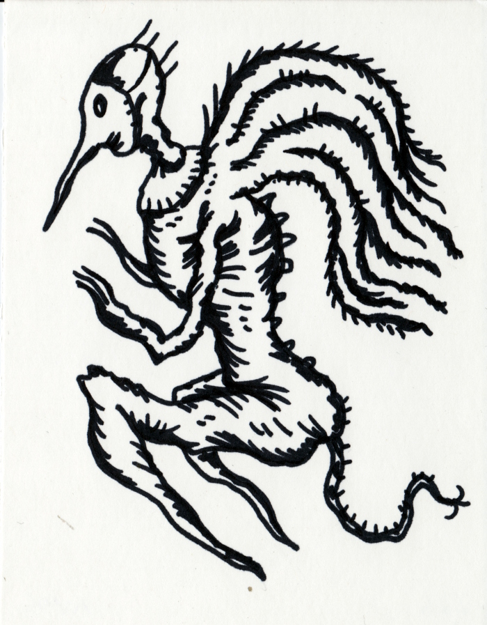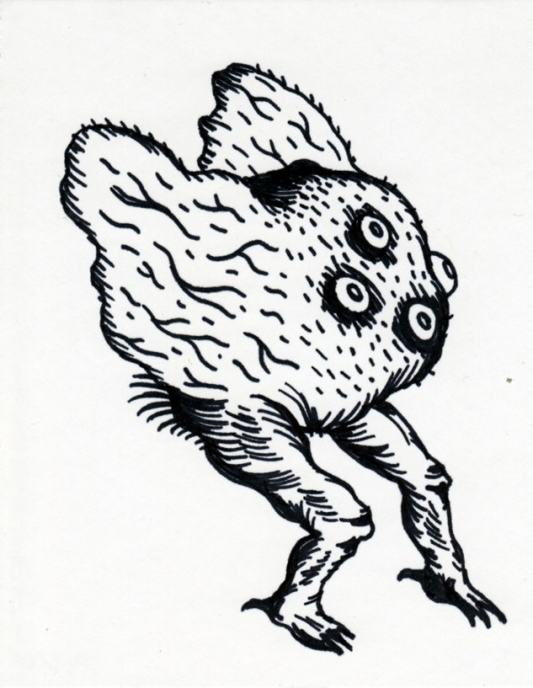 Back in 2006, I purchased five small creature sketches drawn in fine-line marker on card stock by digital artist, illustrator, comicker, and blogger Aeron Alfrey. As I recall, Alfrey’s goal at the time was to draw and sell a thousand sketches and to integrate the creatures in those sketches into his “Hob Bob” comics. Here are the creatures that I selected (numbers 207, 208, 210, 226, and 281, respectively):