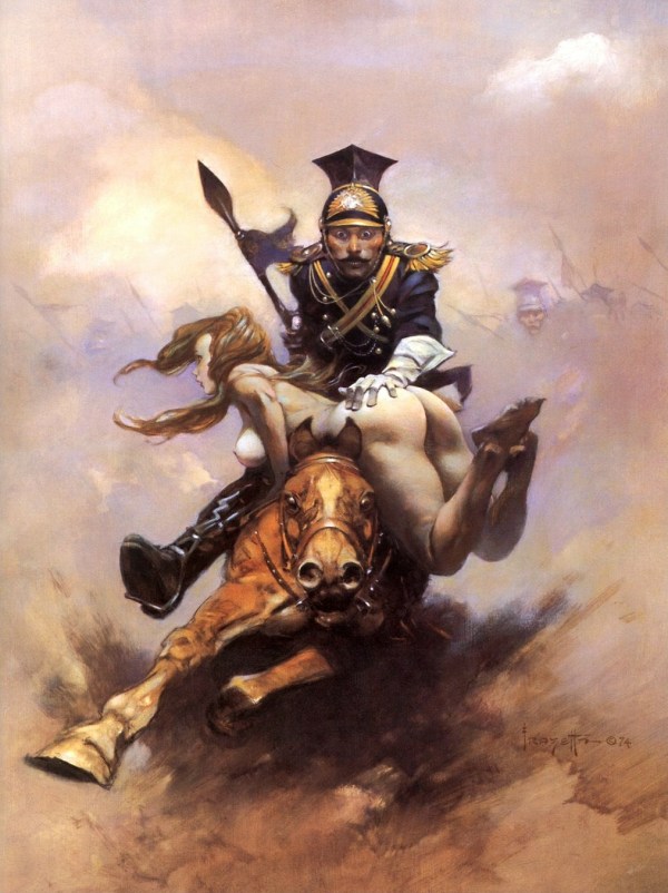 Notice that the unknown artist not only swiped the creature, rider, and composition from Vallejo’s painting but also saw fit to turn the somewhat phallic head and neck of the creature into a raging vein-wrapped erection, with the hint of a scrotum and elements of bondage thrown in to up the sexual ante. Because that’s what passes for creativity in some circles, folks. It’s not about what marvels you can conjure in your imagination and capture with the tools of art but about what you can get away with on the cover of a novel written for teenagers…