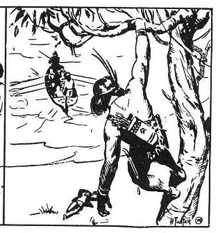 Of course, the similarity of the above album cover for Hawaii by “Johnny Pineapple and his Islanders” to Matt Kish’s collage is pure concidence, but the elements are all there — the intense blue background, the leaning/swaying palm trees, the naked woman, the strategically placed palm fronds — all, that is, except for the triangular symbolic mask (or surface pattern, if you prefer, or target… perhaps it’s an elaborate reticle in the eyepiece of a sighting device used by one of the sailors) that Kish has painted over the face and chest of the woman in his version of the scene (not to mention the angel/devil wing that juts from her back, somewhere behind her right shoulder). The album cover is mundane, an okay photograph of what is obviously a studio set-up of a subject intended to catch your eye in the record bin and let you know instantly that THIS is an LP of “Hawaiian” music, and nothing more. The collage, however, is something more, and it is the mask/pattern/target/reticle, combined with the collage technique itself, which possesses an intrinsic disruptive power, that makes it something more: something more provocative, something more mysterious, something more poetic.