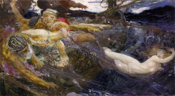 From Wikimedia Commons, the free media repository, here are four studies for The Sea Maiden by British artist Herbert James Draper, along with the dramatic, and oddly erotic, final painting; the eroticism was intentional, of course: