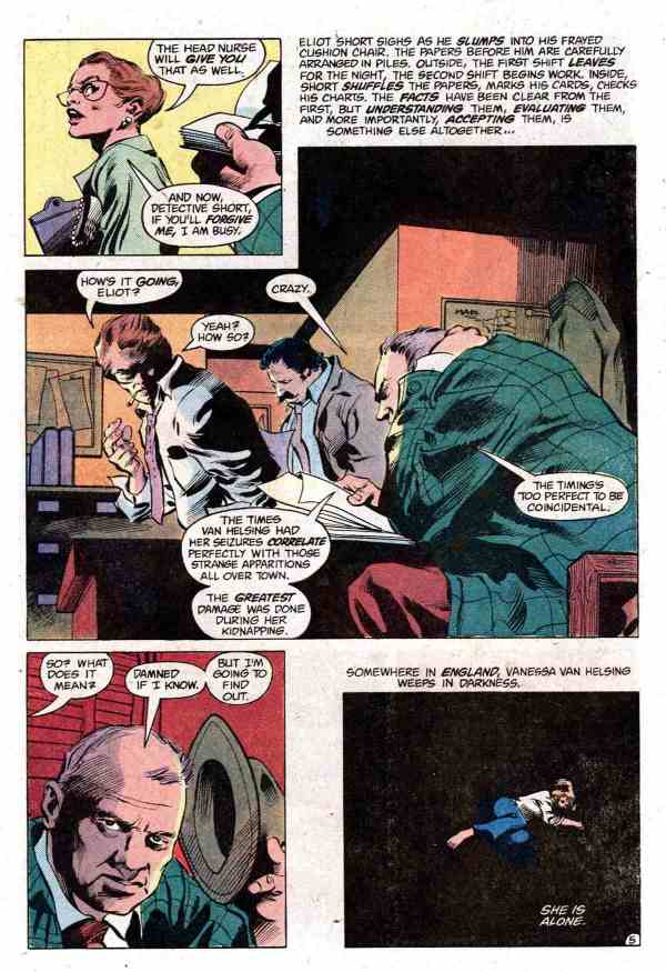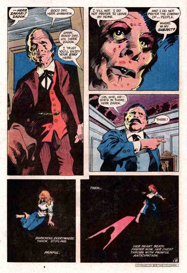 The way Gene bent the human form and seemed to distort the very rectangle of the page worked more effectively, in my mind, in Dracula than in any of his superhero work, or in any of the other horror books he worked on. Comics have always walked a tightrope balancing realism with exaggeration–it’s how cartooning works–but Gene’s work was realistic in a way few artists had ever been, and his distortion was equally uncanny. There was a metafictional aspect to how well it fit the character of Dracula. What Gene could do to the flow of a page defies a lot of what I believe even now about comics layout, and if a young artist tries something that doesn’t work, and justifies it based on Gene’s work, it’s with some pleasure that I can say (short version), “You’re no Gene Colan.”