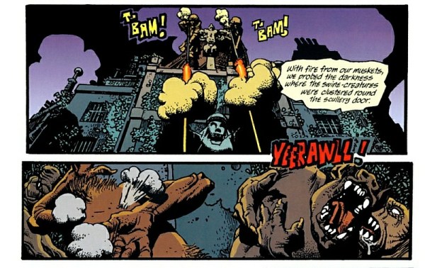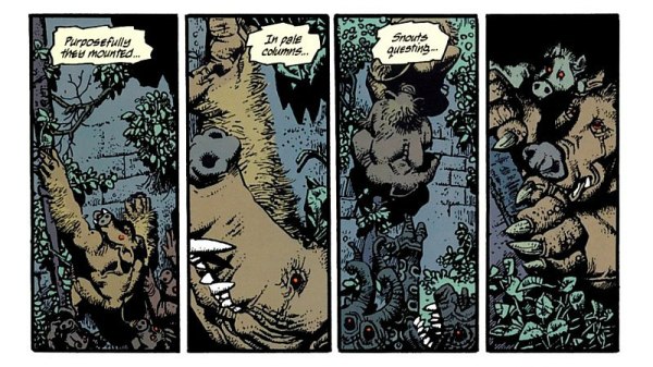 All ten of the pages in the July sale are from the graphic novel, The House on the Borderland (2000), adapted by Simon Revelstroke and Richard Corben from the novel by William Hope Hodgson.