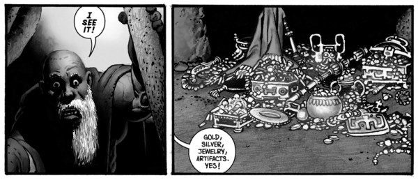 Ten of the pages in the February sale are from the story, “Hellboy in Mexico (Or, a Drunken Blur),” aka “Camazotz,” first printed in Hellboy #46 (Dark Horse, 2010), while the other eleven are from Corben’s own Murky World one shot (Dark Horse, 2012).
