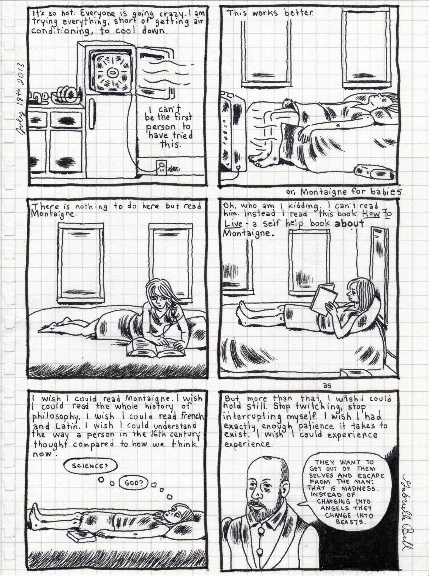 Finally, Bell yesterday posted page one of her “Columbia Comicumentary” and is (again) selling the original art as she posts each page. The new pages are slightly more expensive than the “July Diary 2013” pages were, but even so, they are probably still under-valued when one considers Gabrielle Bell’s past accomplishments and growing stature in the world of comics.