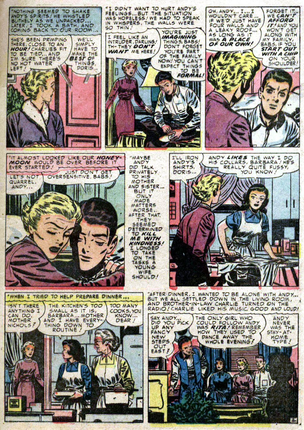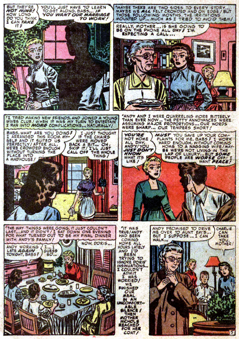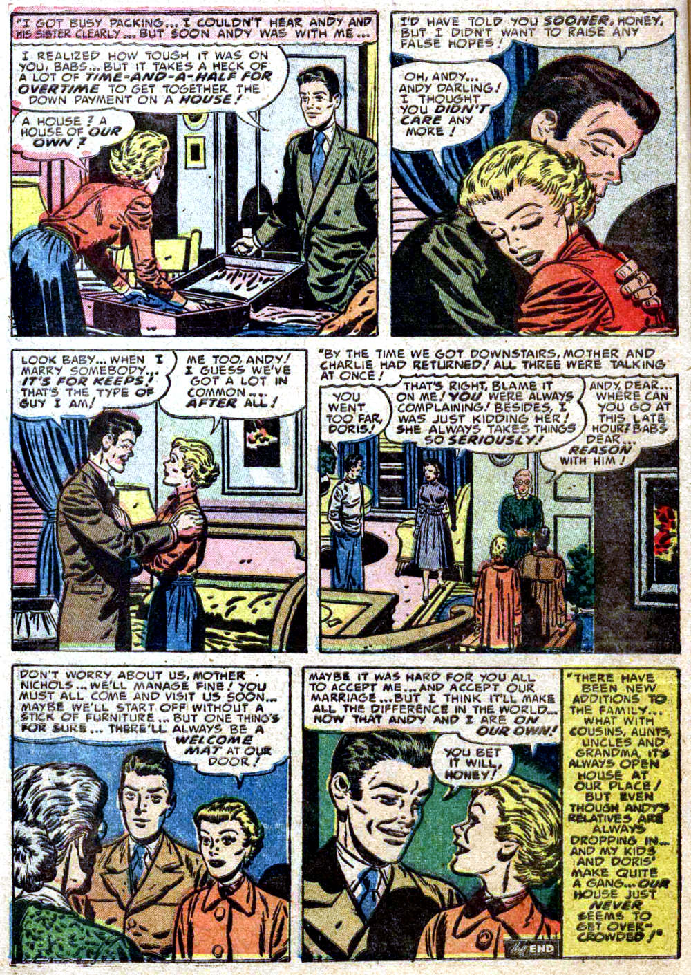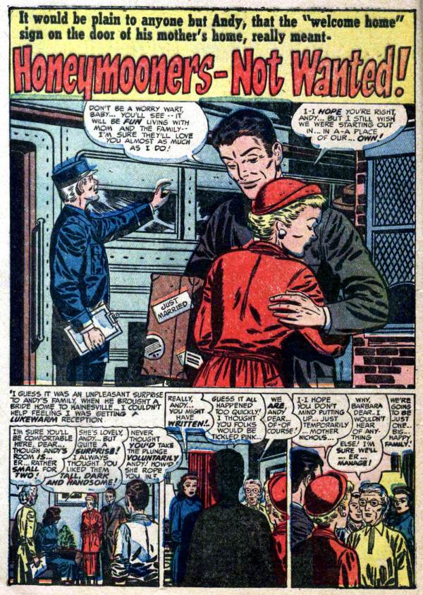 Time for more comics, I think. This time around, we’ve got “Honeymooners — Not Wanted!” from Young Romance #49 (vol. 6, no. 1); neither the script nor the art are credited in the comic, and comics.org hasn’t indexed the issue yet, but foolhardy pseudo-aficionado that I am, I’m going to go head and attribute the art, at least, to a long-time RCN favourite, Bill Draut: