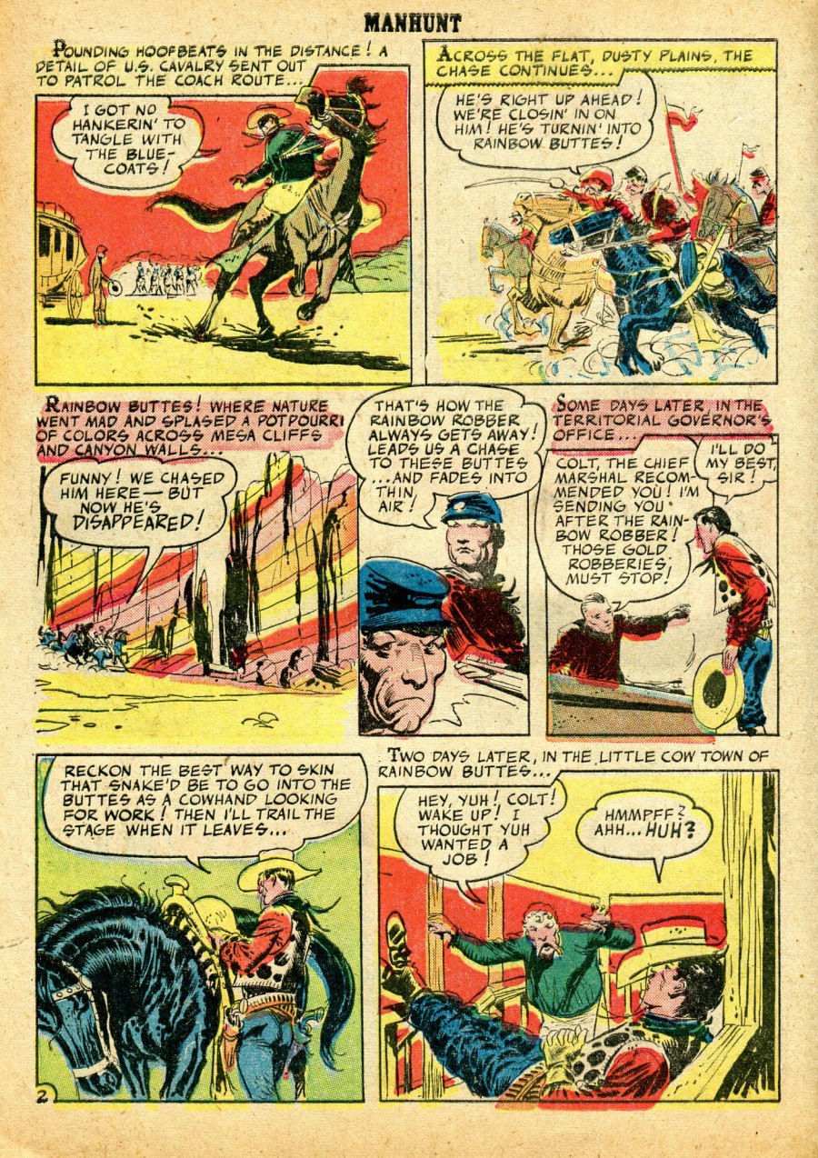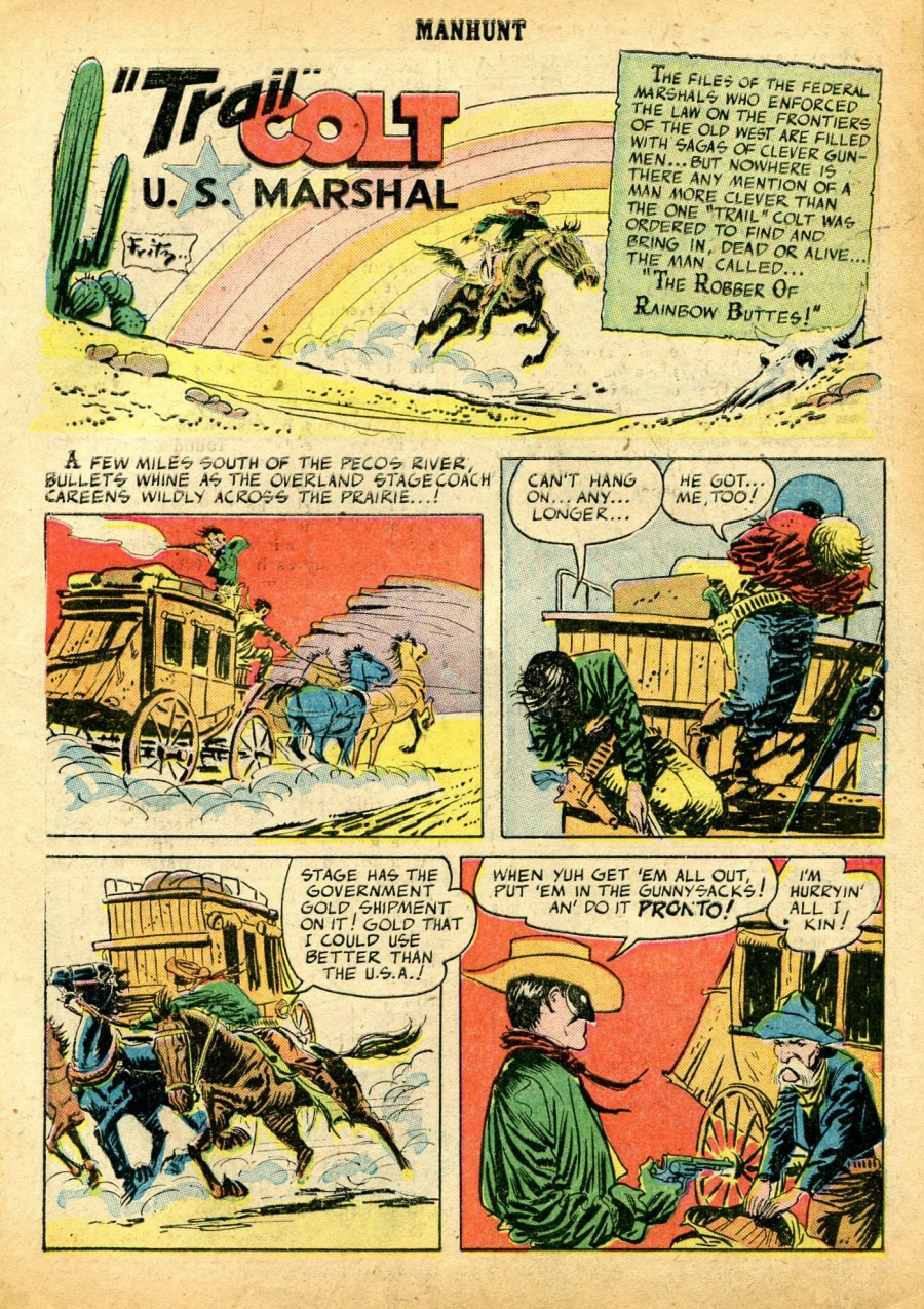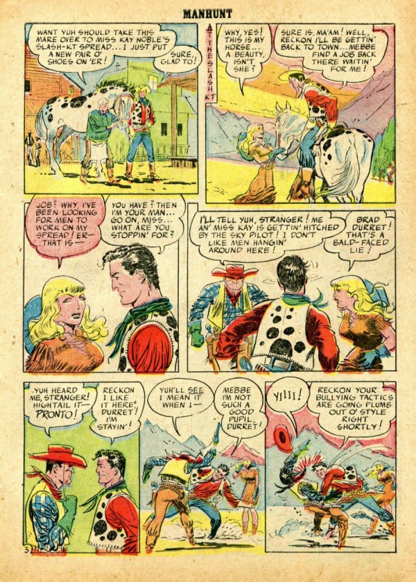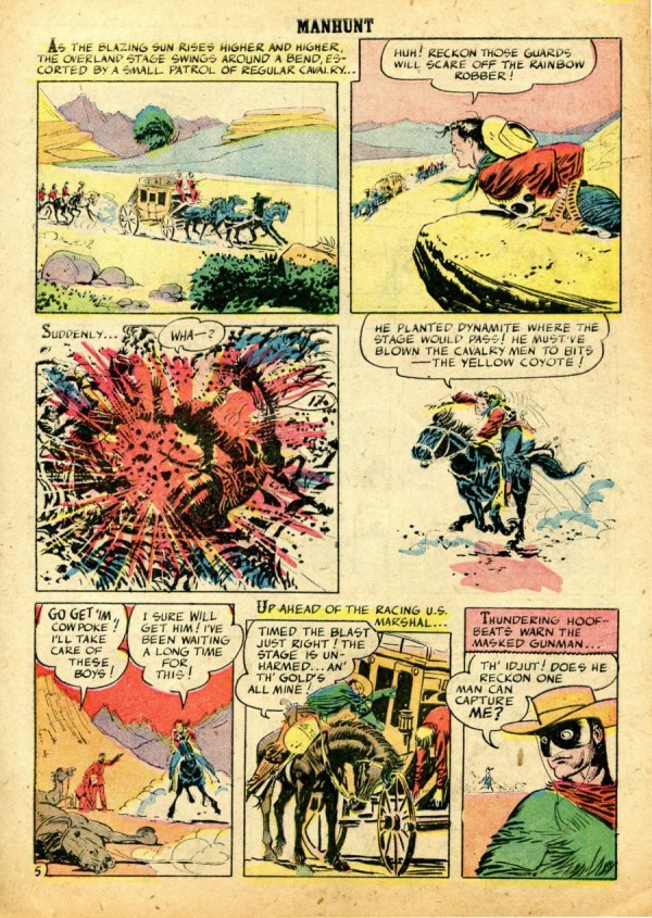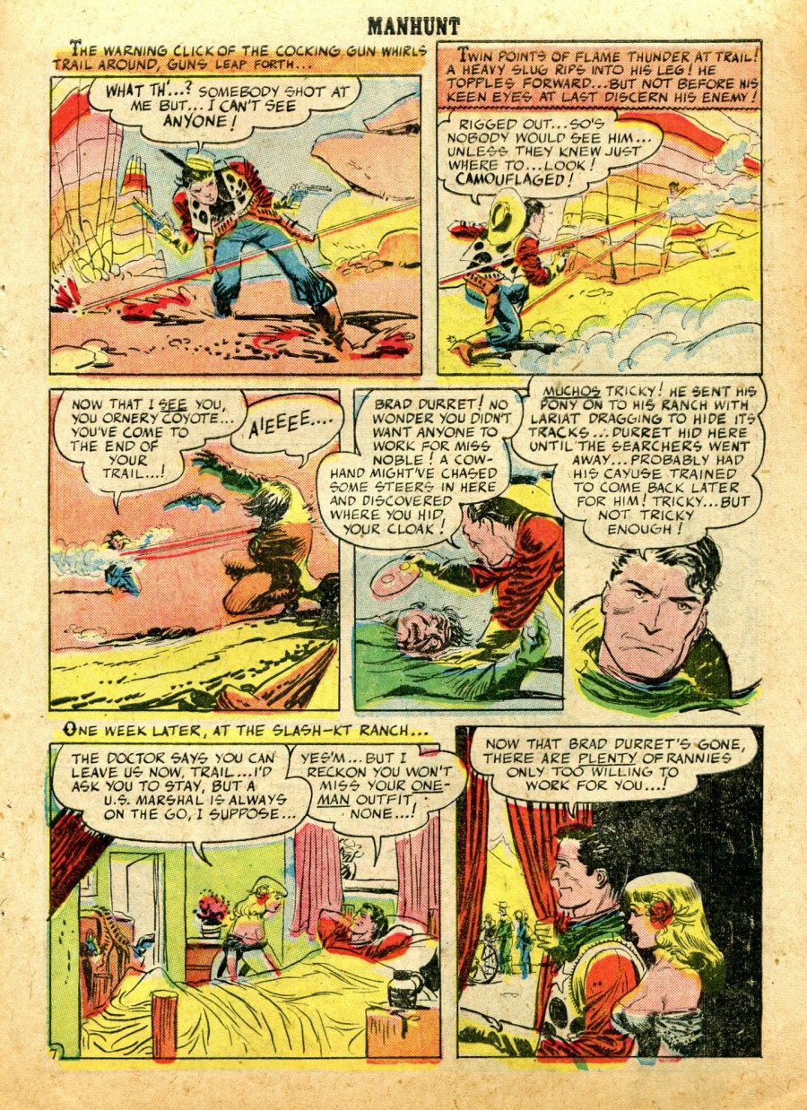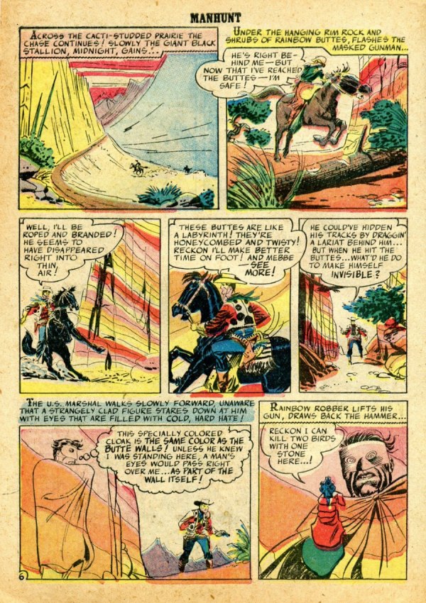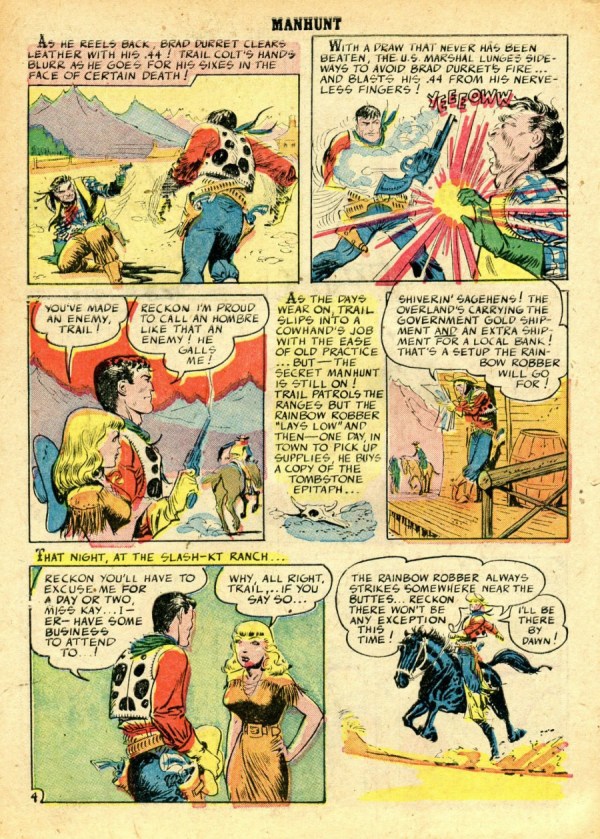 From Manhunt #11 (August-September 1948), here’s an instalment of “‘Trail’ Colt, U.S. Marshal” entitled “The Robber of Rainbow Buttes,” with visuals vigorously delineated by “Fritz,” a.k.a. Frank Frazetta: