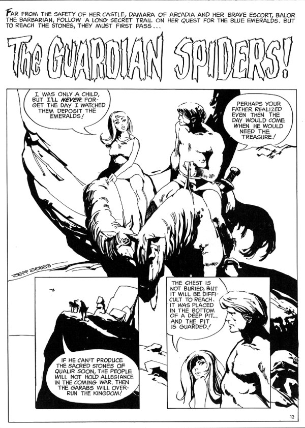 According to the authors of Jeffrey Jones: The Definitive Reference, Jones drew “The Guardian Spiders” for King Comics in 1967. Unfortunately for the artist, however, King failed to publish the story before they closed shop for good in December of 1967 and sold various titles and inventory to Gold Key and Charlton. And thus it was that “The Guardian Spiders” languished unloved in the files at Charlton for seven years or so until the editors at The Charlton Bullseye arranged for its first publication in their zine.