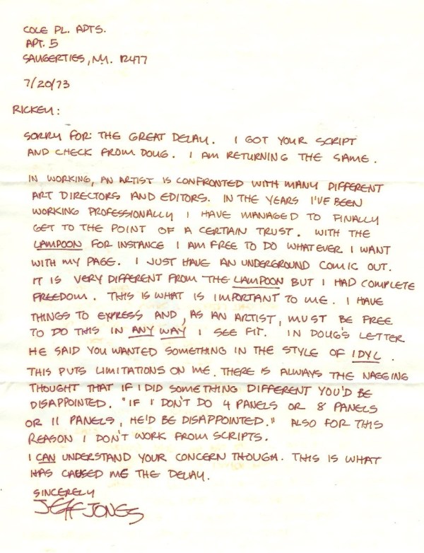 The first time I saw the following hand-written letter, it was for sale on ebay. Having been an admirer of Jones’s ongoing self-education and steady development as an artist since the early 1980s, when in my late teens I purchased in quick succession the three Dragon’s Dream books, The Studio, Yesterday’s Lily, and Idyl, I was sorely tempted. But I could not afford at the time to bid for it — or, at least, I didn’t feel like I could justify the expense to my wife — so I let it slip through my fingers. However, as a compensation of sorts, I saved the JPEG from the auction listing so that I could re-read it later for inspiration, because the fact is that I DID, for various personal and professional reasons I won’t go into here, find it tremendously inspiring. But then, somehow, I misplaced the JPEG when I moved all my e-stuff to a new computer, this computer, and the fact is, I thought at that point I would never get to read it again. And I was okay with that. I shrugged and moved on. It wasn’t that big a deal. But today is my lucky day, because here it is: