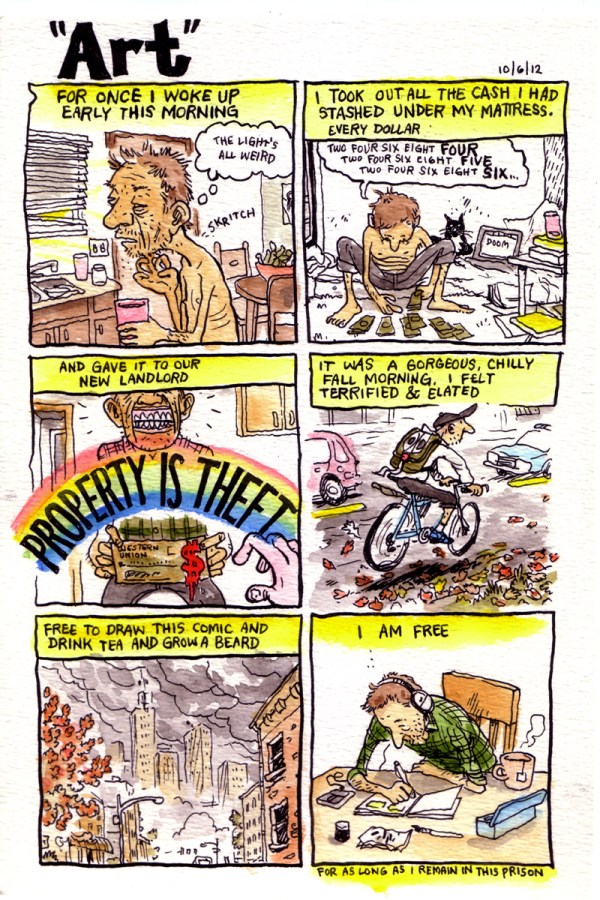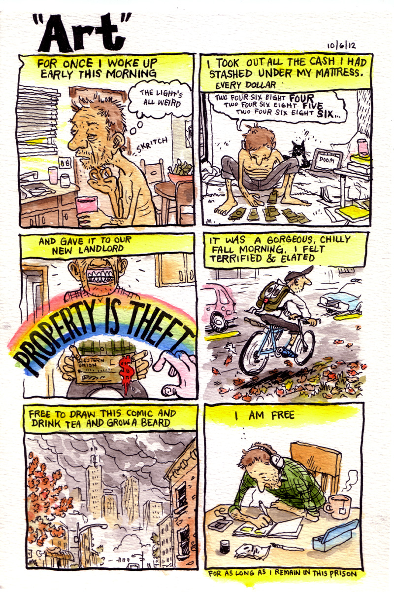 I sound like a crank here, and maybe even petty, mentioning specific figures and circumstances like this, but I hate that artists don’t talk about this stuff forthrightly. It’s not embarrassing or a big mystery — it’s a matter of survival. No one seems to talk about how living costs are the most important thing for an artist to take care of. All the various grants I look into cover “project costs,” etc., but simple food and rent is never mentioned, or the use of the grant monies to pay basic costs of living is outright prohibited. I don’t get that. It’s anti-artist. I don’t want something called a “residency” — I want my food and housing covered so I don’t need a day job, so I then have time to do more of my work. A lot of this seems to stem from the idea of “arts” rather than artists; anytime I hear the word “art” with an “s” after it, I know it’s nothing more than a pointless bureaucracy of money gatherers with no interest in helping individuals. So the city ballet, city symphony, maybe summer programs for kids, get funded, but not individual artists with years of disciplined work behind them.