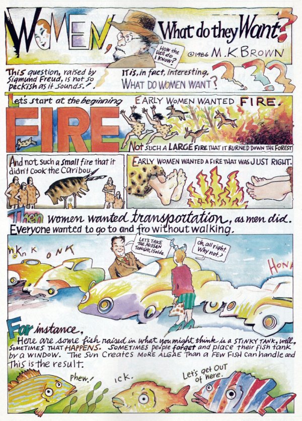 One of the funniest cartoonists of the last four decades, M.K. Brown has accumulated a body of work long savored by aficionados but never comprehensively collected — until now. Women, What Do We Want? is the first retrospective collection of Brown’s cartoons and comic strips from the National Lampoon from 1972-1981, as well as other magazines such as Mother Jones, The New Yorker, Atlantic Monthly, and Playboy; and her comics from underground publications like Arcade, Wimmin’s Comics, Young Lust, and Twisted Sisters.