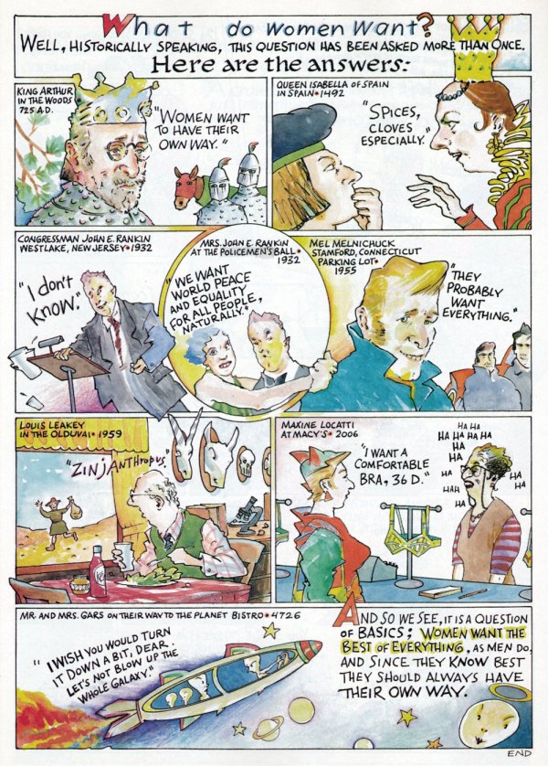 And what about men? Don’t worry — you’ll meet Mr. Science and his pointless experiments; “Earl D. Porker, Social Worker,” who converses with household items and forgets the cat food; a man whose head is a basket of laundry; and others.