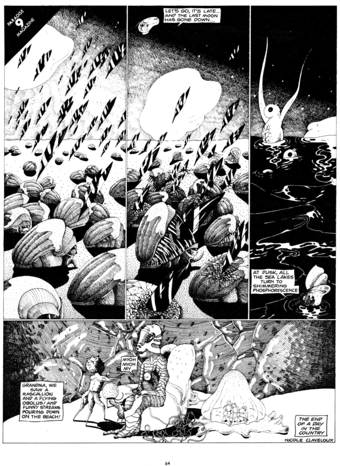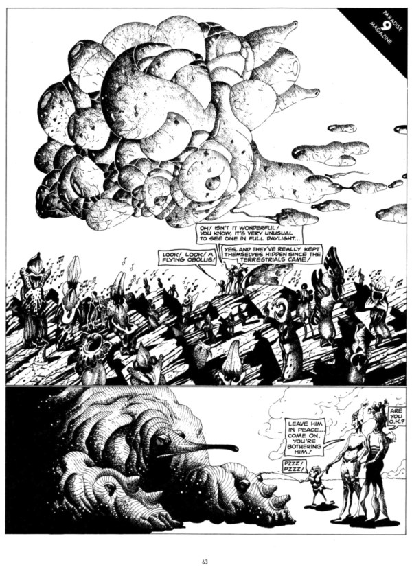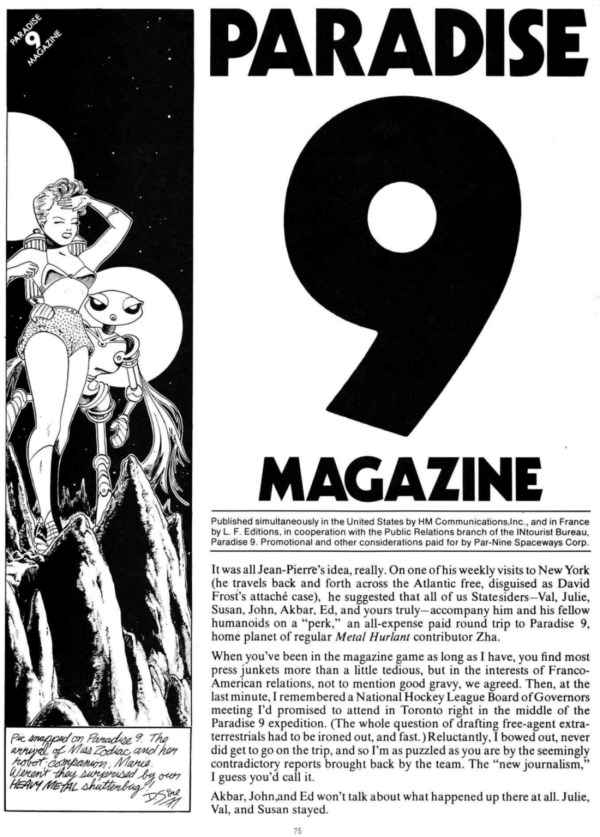 From Heavy Metal vol. I, no. 13, here is Nicole Claveloux‘s contribution to “Paradise 9 Magazine,” a compendium of short, journalistic visual reports by a select group of cartoonists who had recently been on “an all-expense paid round trip to Paradise 9, home planet of regular Metal Hurlant contributor Zha“: