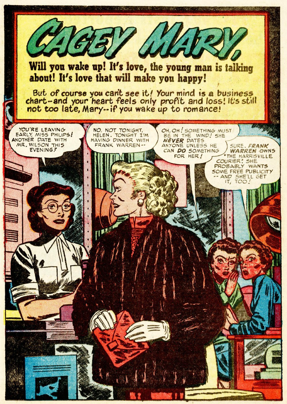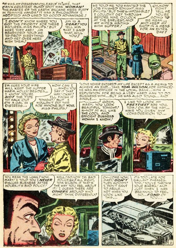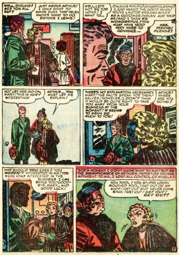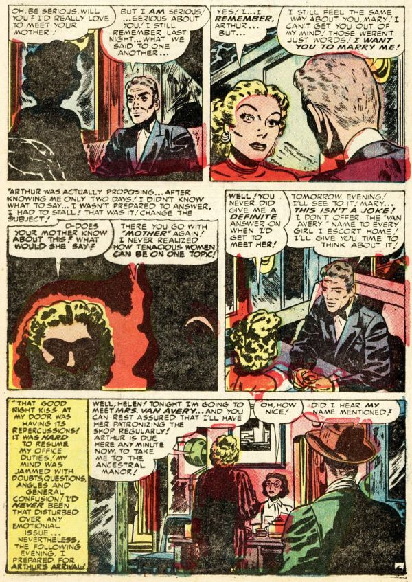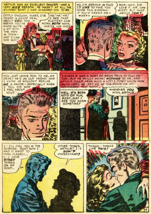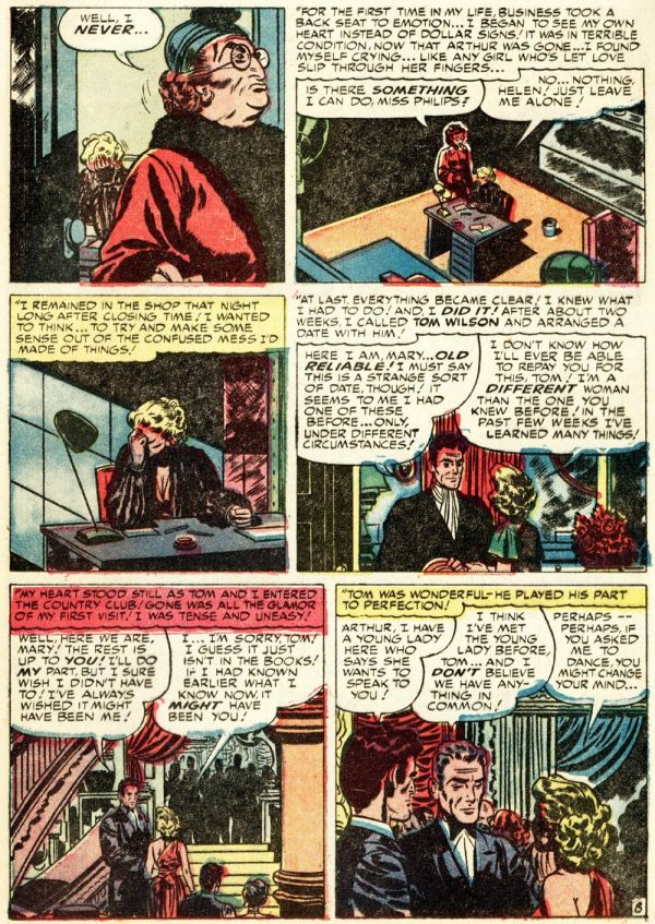 From Young Romance vol. 5, no. 2 (#38), here’s “Cagey Mary”; the script and art are uncredited, and comics.org doesn’t attribute the work to anyone, but I am quite sure the artist is Bill Draut, whose early, underappreciated contributions to comics have been featured here at RCN several times over the years:
