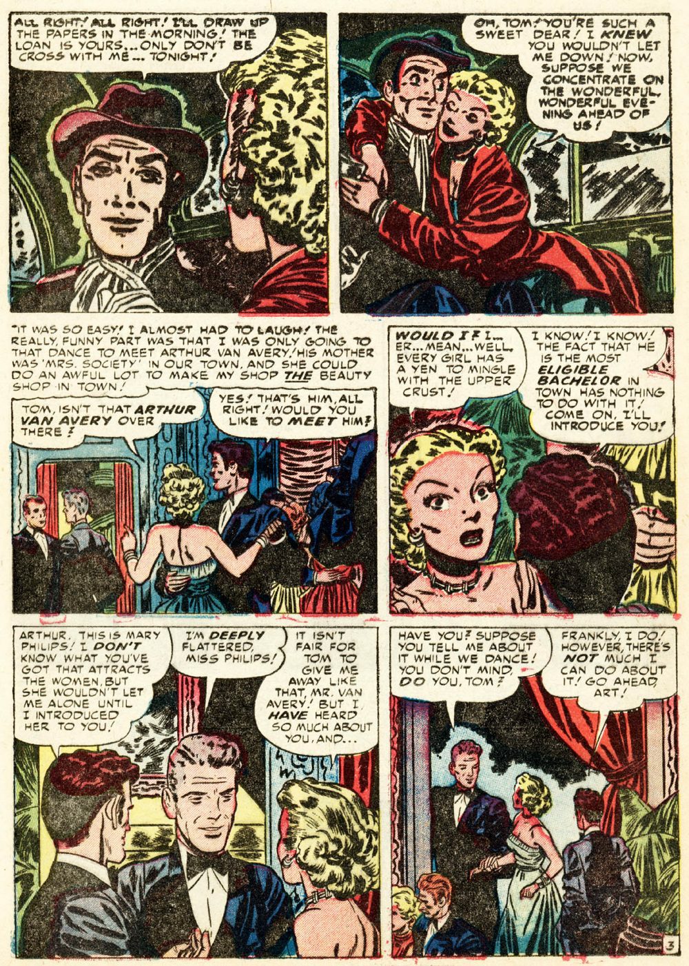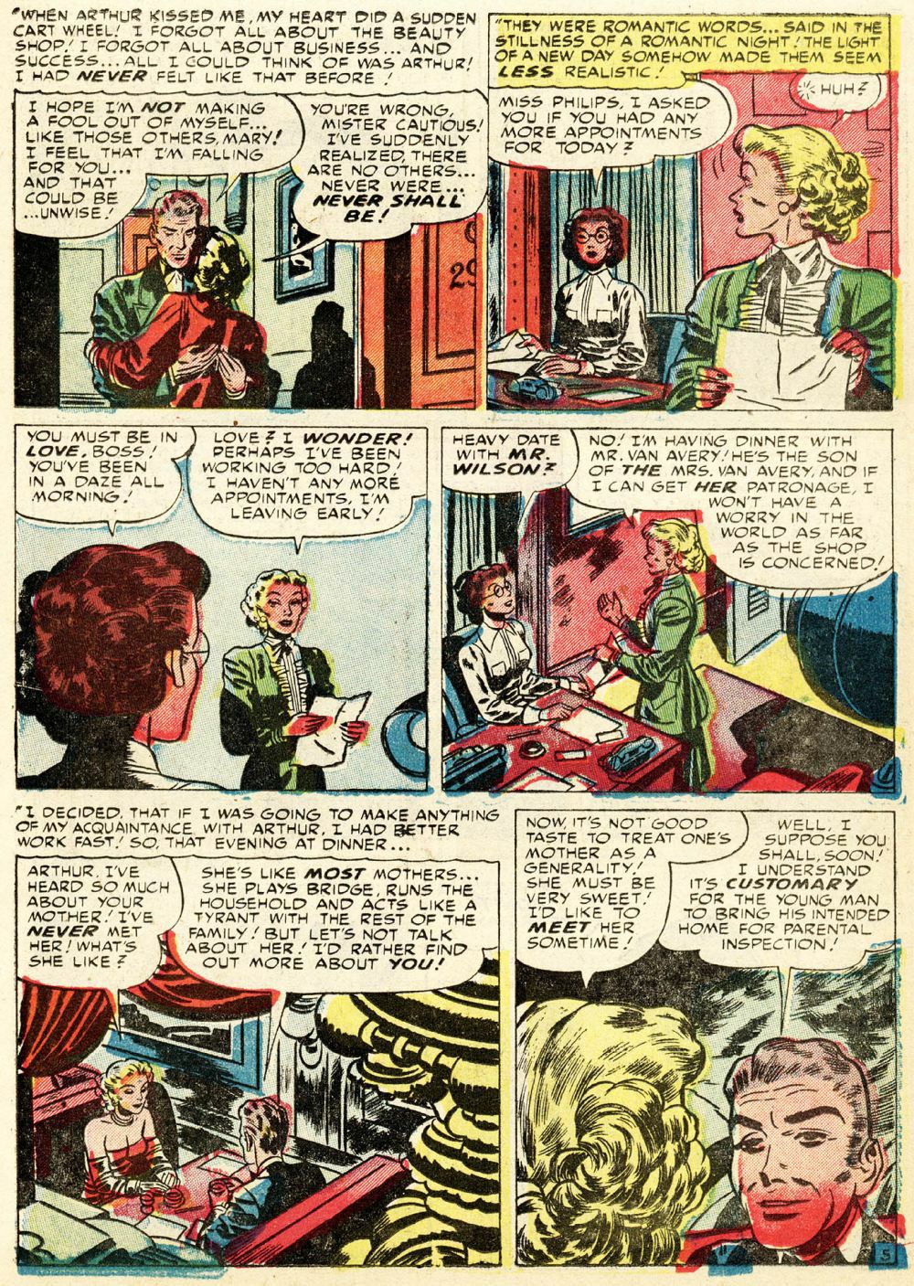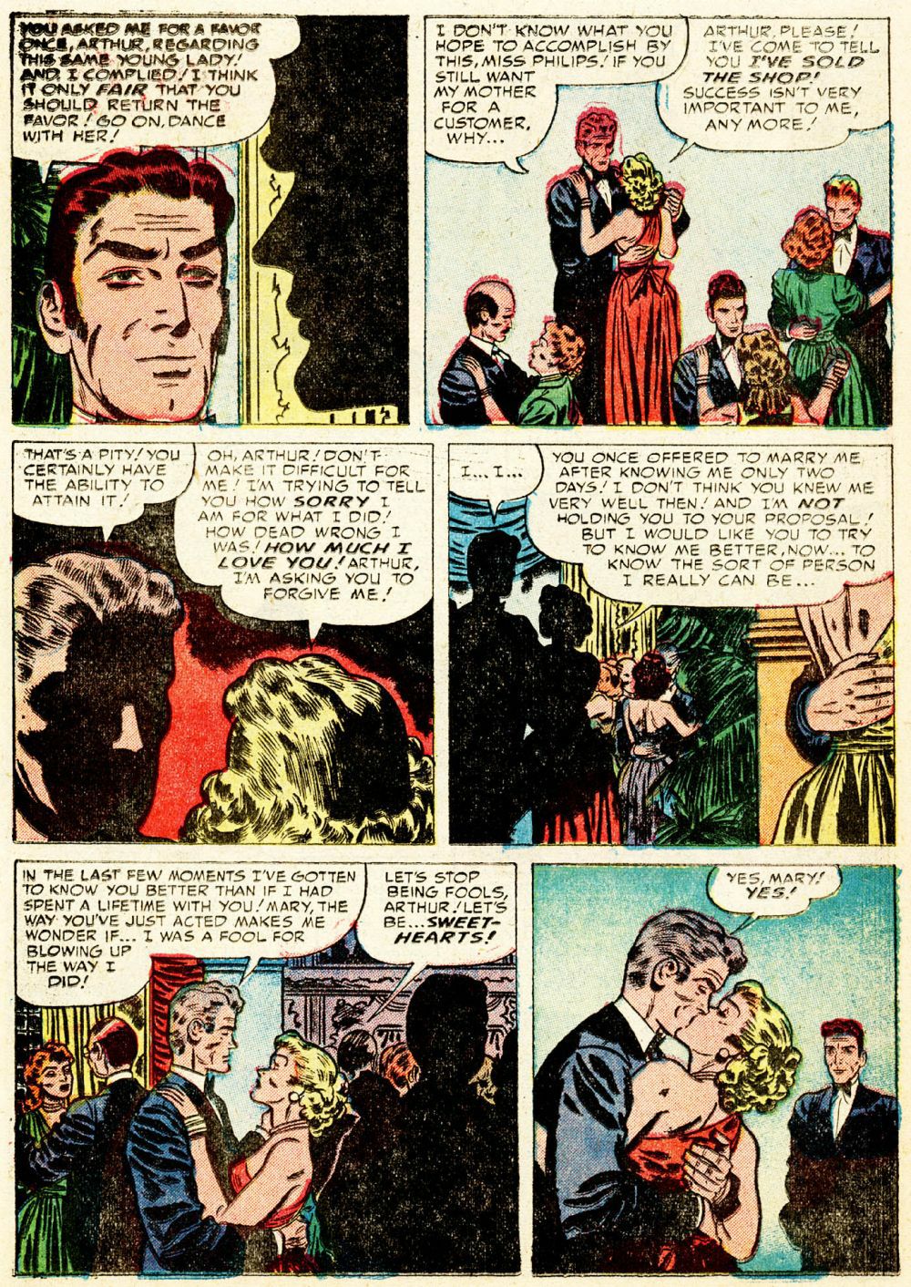 From Young Romance vol. 5, no. 2 (#38), here’s “Cagey Mary”; the script and art are uncredited, and comics.org doesn’t attribute the work to anyone, but I am quite sure the artist is Bill Draut, whose early, underappreciated contributions to comics have been featured here at RCN several times over the years: