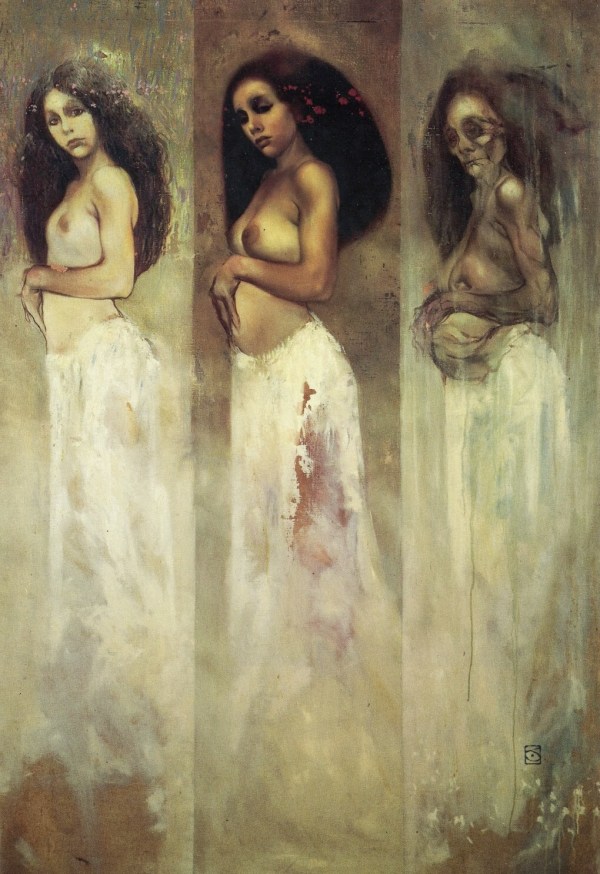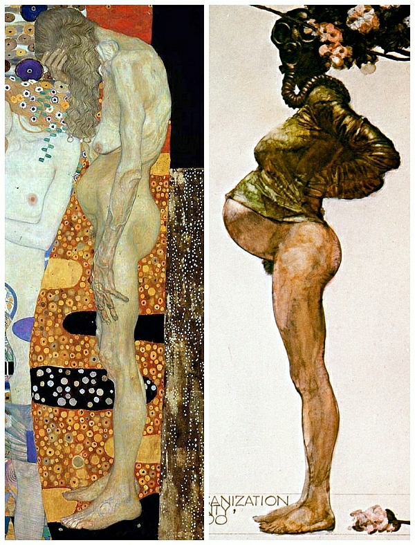 Not sure if this has been remarked previously, perhaps it has, but it seems clear enough to me that the masked, pregnant woman in Jeffrey Jones’s Descent (1977) was inspired by the old woman in Gustav Klimt’s The Three Ages of Woman (1915):