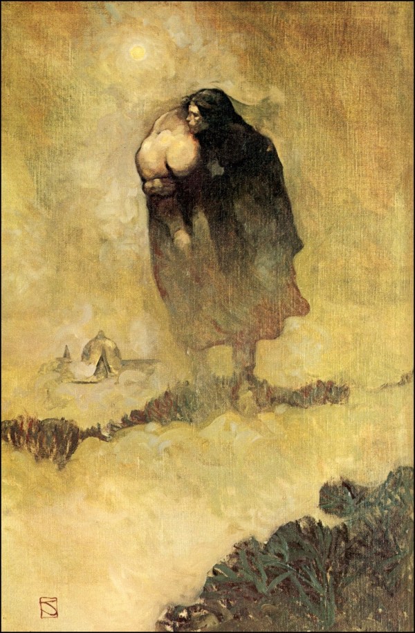 ABOVE: Frank Frazetta, The Executioner (1955). Here, Frazetta has made the same “mistake” as Jones did in the illustration I highlighted above. The baddie on the throne is fat, yes, but the throne itself, which shares some decorative elements with Frazetta’s later design, is pathetically, laughably, squat and tiny, so not only does the fat man not fit in it at all but nobody else in the scene would sit comfortably in it either, although… maybe in this case, that’s the point, i.e., to make the bad guy look buffoonish. As we have seen, however, when Frazetta took at second run at that design in 1963, he made improvements that showed he knew how to do it “right.”