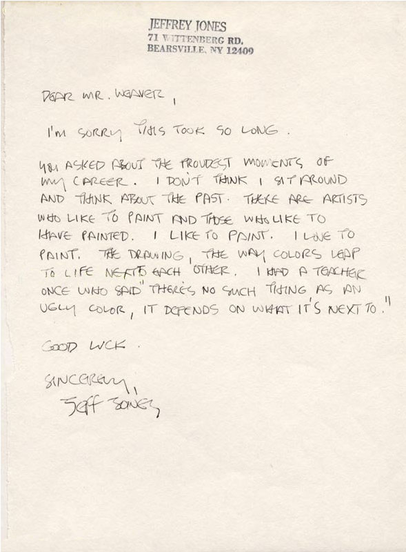 The first time I saw the following hand-written letter, it was for sale on ebay. Having been an admirer of Jones’s ongoing self-education and steady development as an artist since the early 1980s, when in my late teens I purchased in quick succession the three Dragon’s Dream books, The Studio,Yesterday’s Lily, and Idyl, I was sorely tempted. But I could not afford at the time to bid for it — or, at least, I didn’t feel like I could justify the expense to my wife — so I let it slip through my fingers. However, as a compensation of sorts, I saved the JPEG from the auction listing so that I could re-read it later for inspiration, because the fact is that I DID, for various personal and professional reasons I won’t go into here, find it tremendously inspiring. But then, somehow, I misplaced the JPEG when I moved all my e-stuff to a new computer, this computer, and the fact is, I thought at that point I would never get to read it again. And I was okay with that. I shrugged and moved on. It wasn’t that big a deal. But today is my lucky day, because here it is: