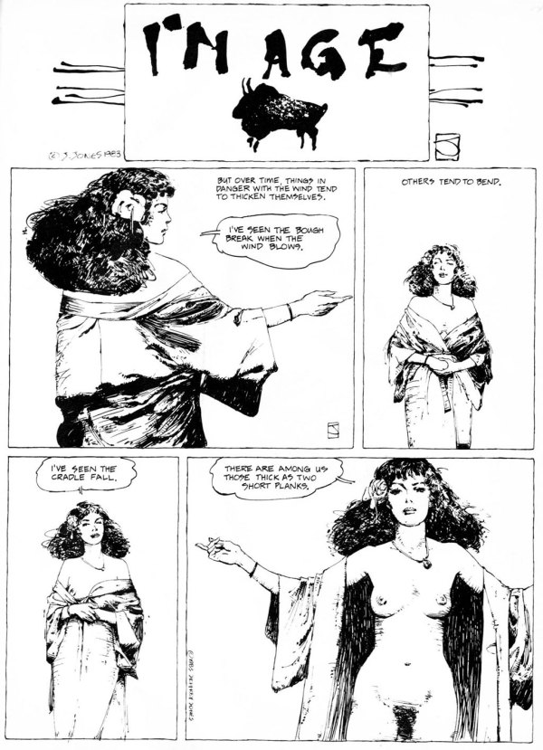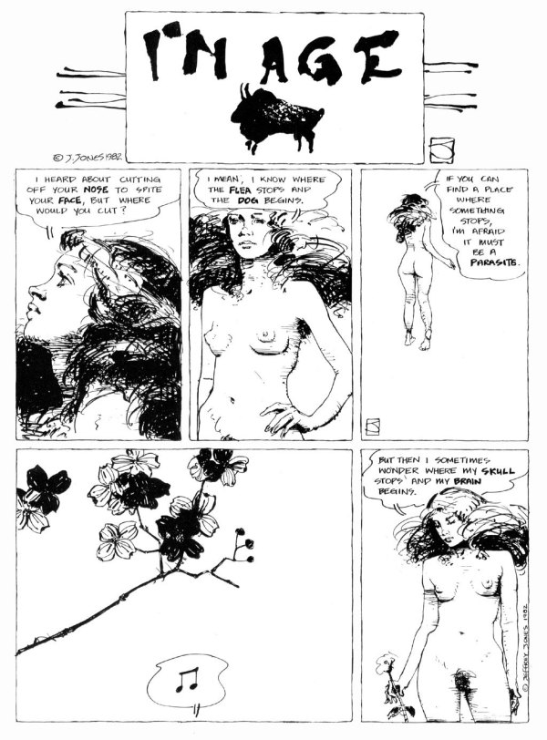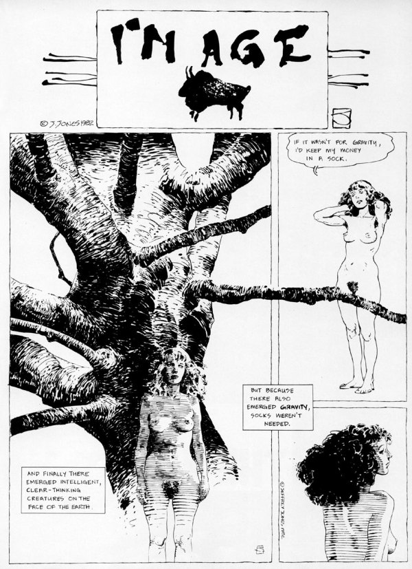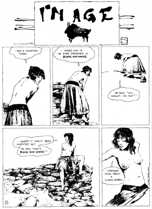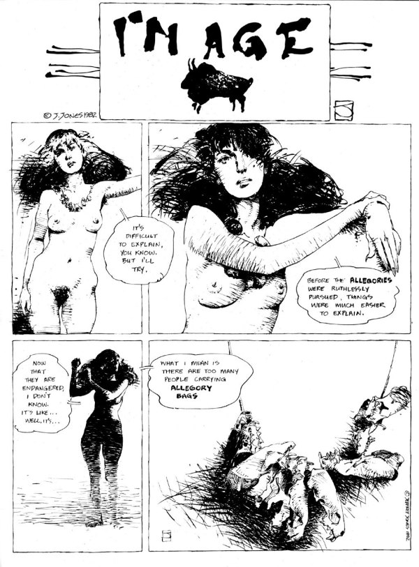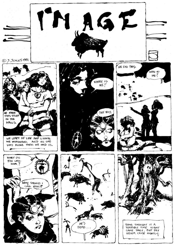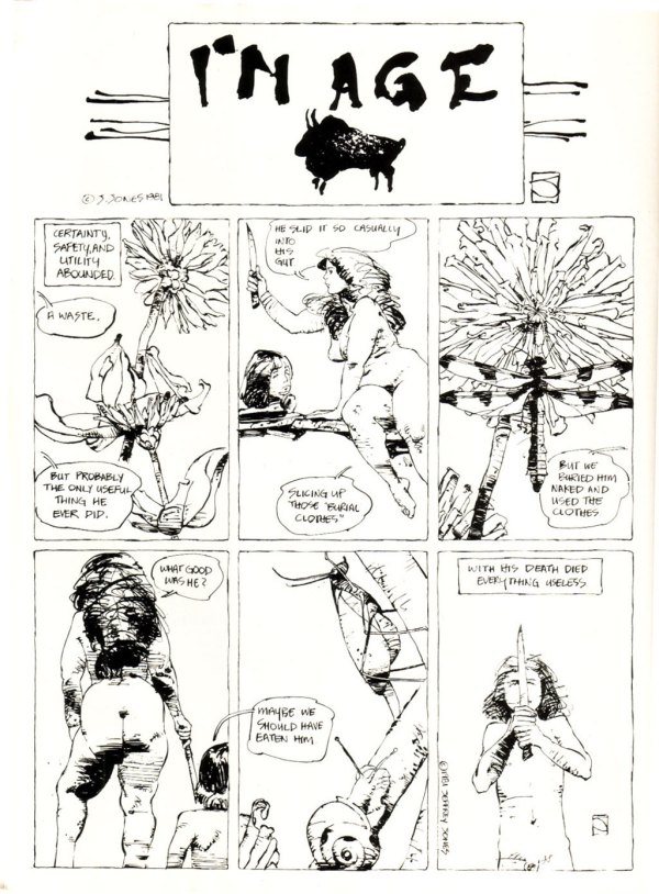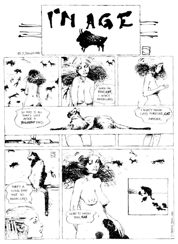 Late to the party again… but life (and laziness!) gets in the way… anyway… last year, near the end of the summer, Donald M. Grant published the first-ever all-in-one collection of two comic strips by Jeffrey Jones: Idyl, which originally ran in National Lampoon in the 1970s, and I’m Age, which ran in Heavy Metal in the early 1980s.