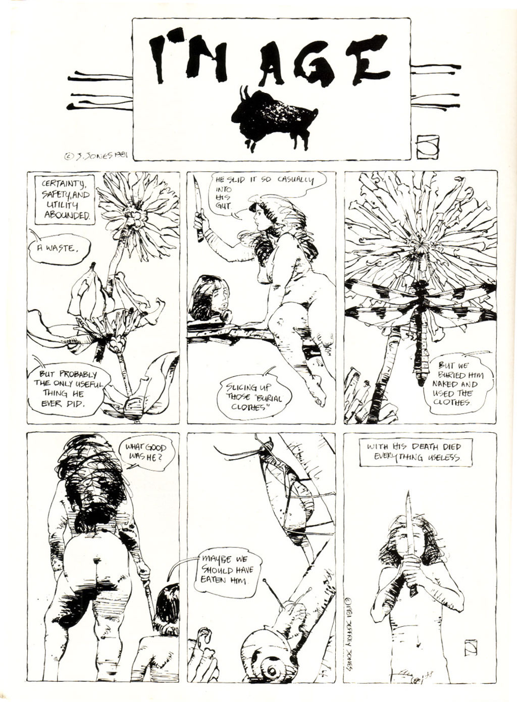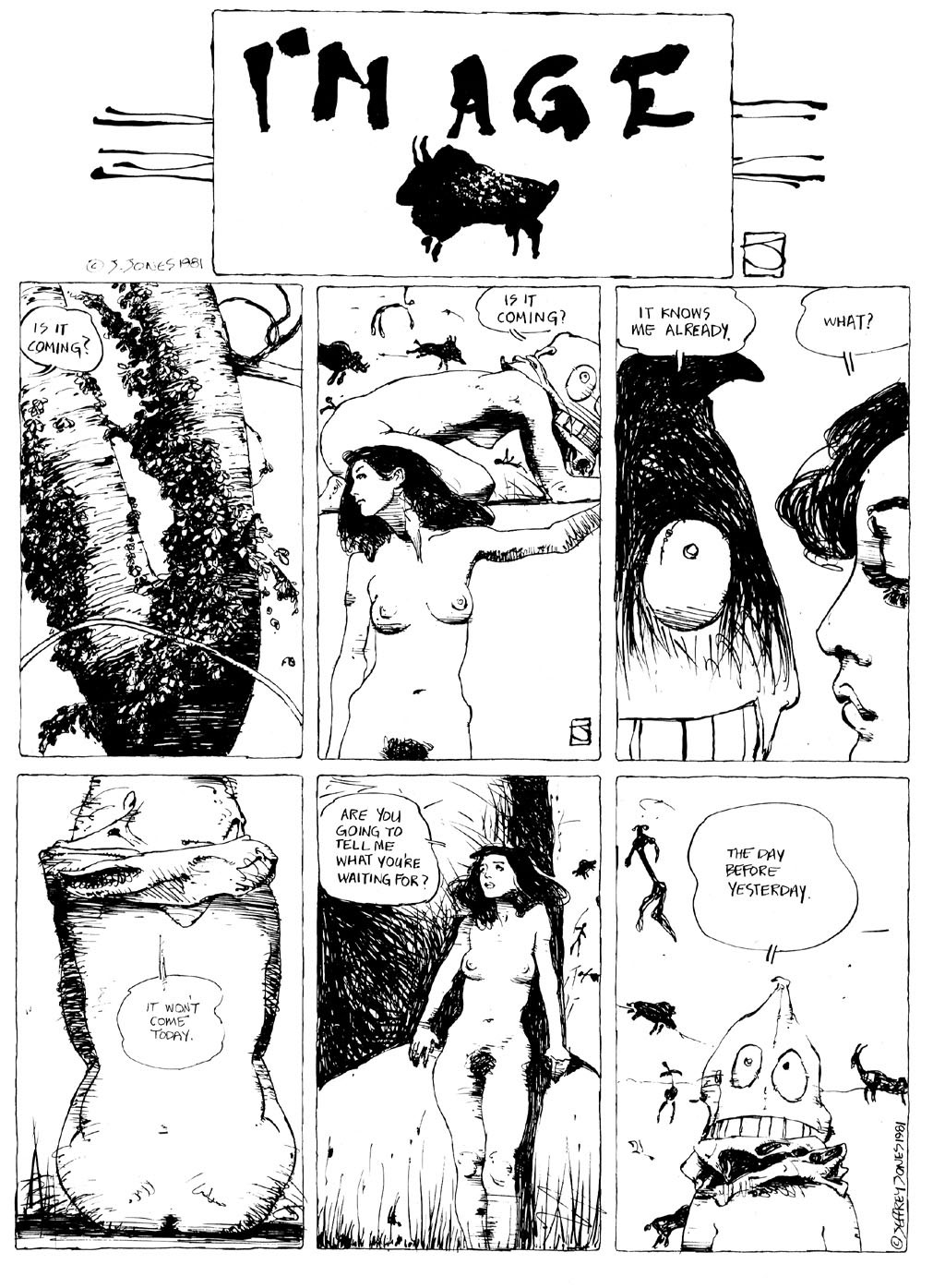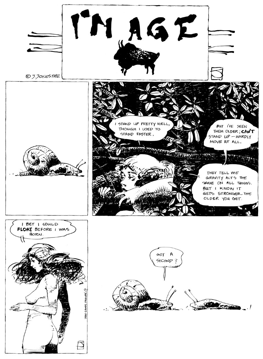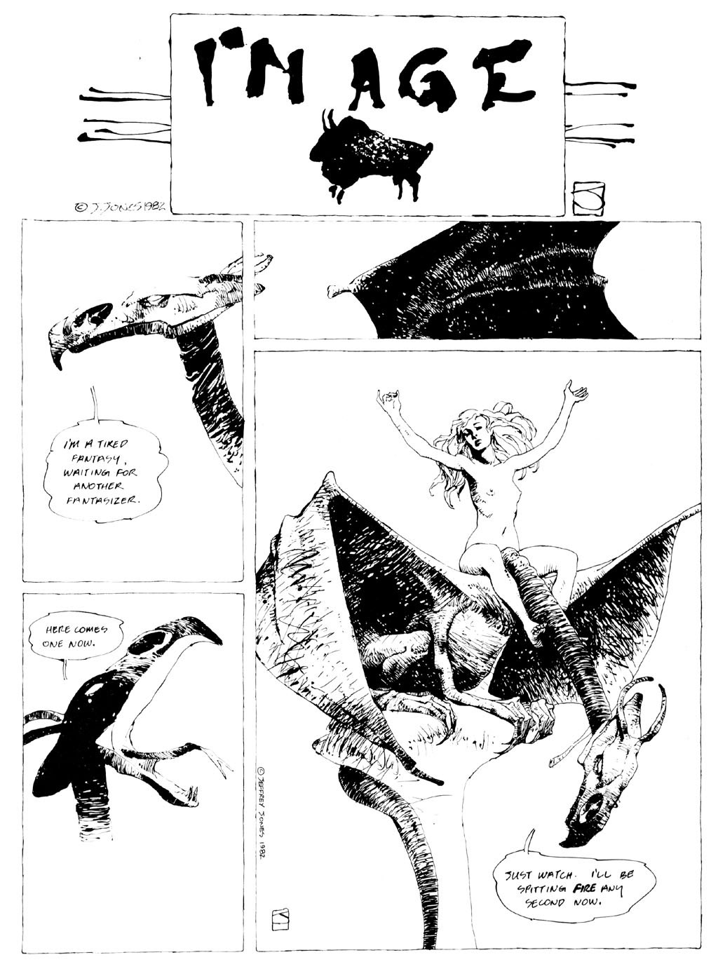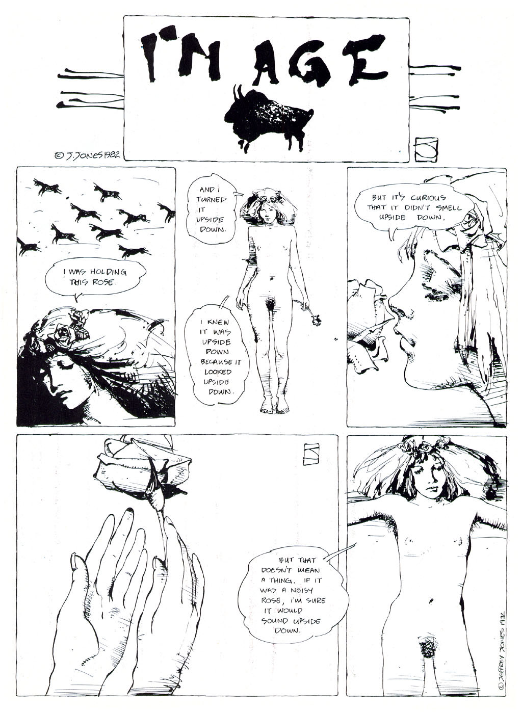 Late to the party again… but life (and laziness!) gets in the way… anyway… last year, near the end of the summer, Donald M. Grant published the first-ever all-in-one collection of two comic strips by Jeffrey Jones: Idyl, which originally ran in National Lampoon in the 1970s, and I’m Age, which ran in Heavy Metal in the early 1980s.
