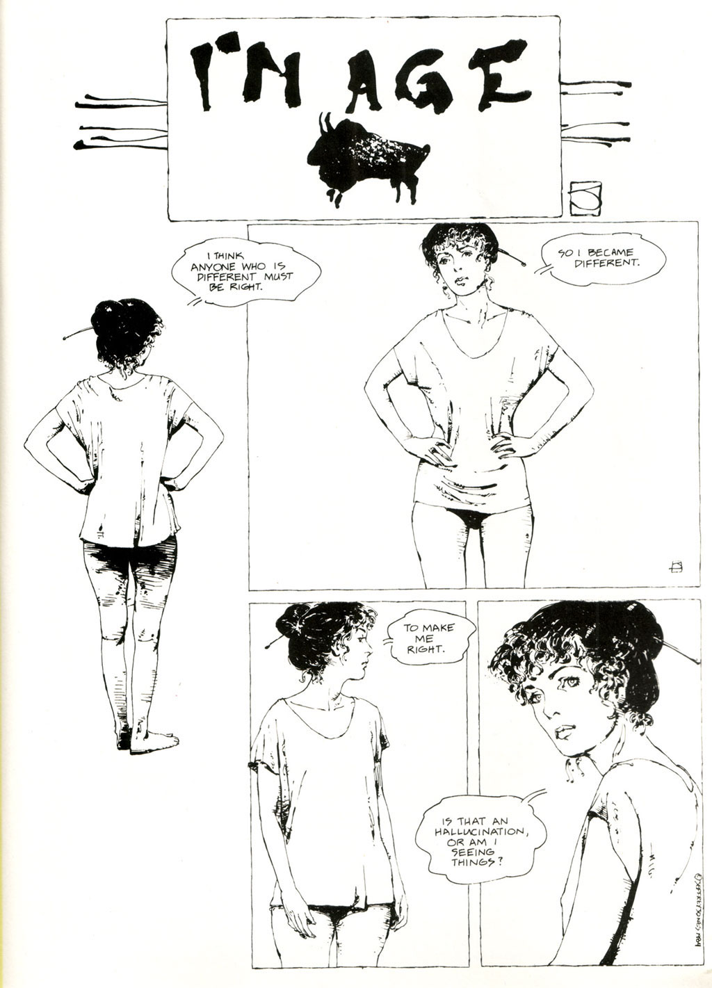 My concern is that the introductory and other text in the collection completely ignores Jones’s struggle, in later years, to claim a more authentic identity for herself as a woman. No mention, even, of the name change from Jeffrey Jones to Jeffrey Catherine Jones. Now, Jeffrey Catherine Jones was, by all accounts, perfectly content to let her old friends continue to refer to her as Jeffrey, and of course, the major collection of her art published during her lifetime, with her participation, after she began her transition, bore the title, Jeffrey Jones: A Life in Art. Still, it seems wrong to me for Jones’s “friends” to act, now (or then), as though Jeffrey *Catherine* Jones never existed! The omission is especially egregious in George Pratt’s “Afterword,” which recounts an outing that was filmed, in part, by Maria Paz Cabardo for her documentary, Better Things: The Life and Choices of Jeffrey Catherine Jones. If you’ve seen the footage, you know very well what I’m talking about!