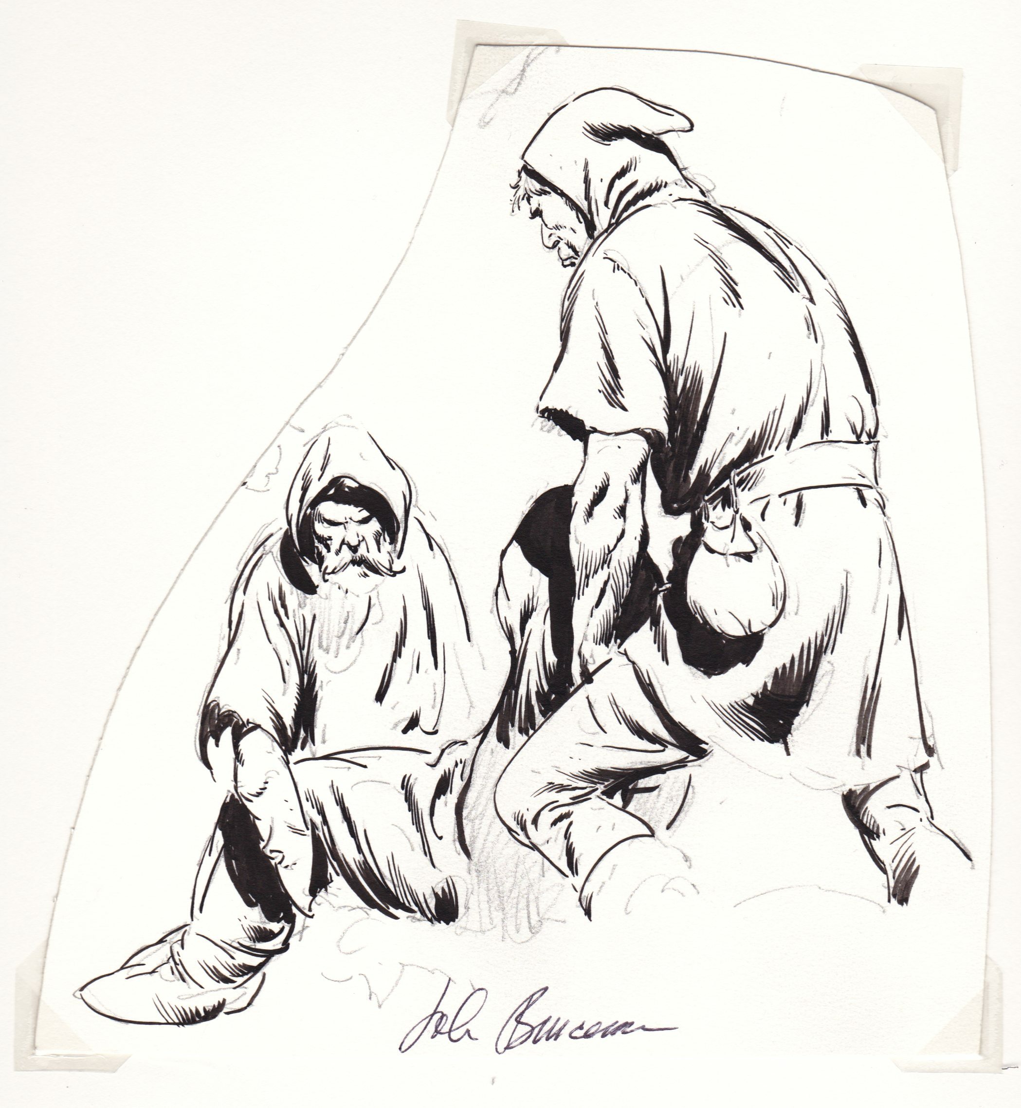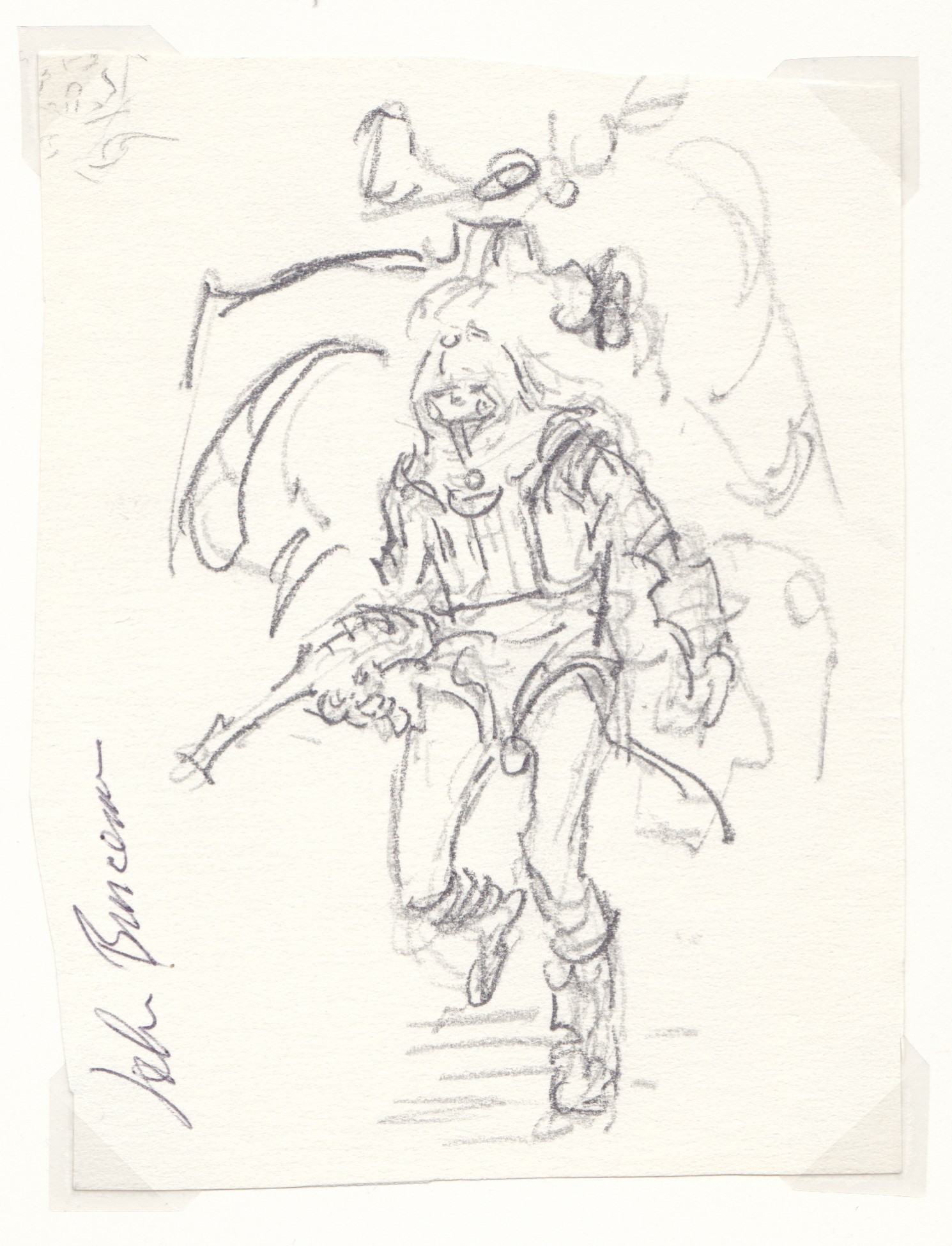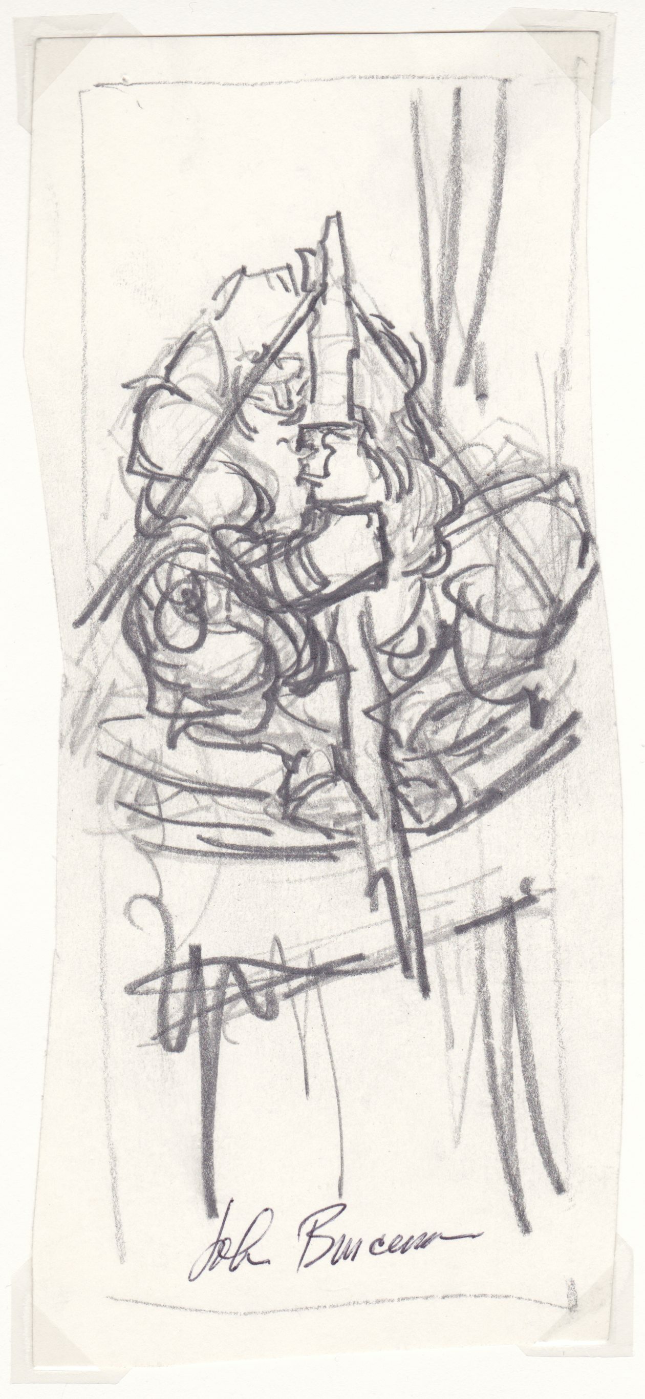 As excellent as his comics art was, especially when he inked his own work, John Buscema did not love to draw comics. He did, however, love to draw. Even after a full day’s work in the “Marvel Bullpen,” Busema’s idea of relaxation was to spend a few hours in the evening covering sketchbook sheets, copier paper, surplus comics boards, and even the backs of pages destined for reproduction, with sketches and studies that not only related to whatever work he had on his plate at the time but also served as an outlet for his personal obsessions — cowboys, horses, pirates, vikings, beautiful women, big cats, hand-to-hand combat, unusual character faces, etc., etc.