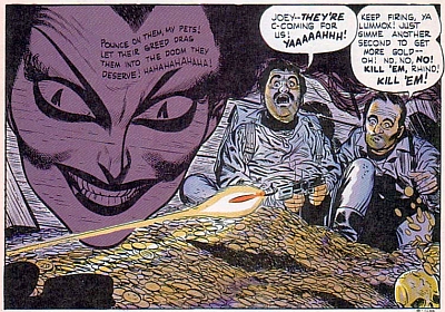 But as affecting to me as the visual splendor of Moebius’ images was the awesome silence of his world. It was a silence unlike any other in my experience of comics; monumental, grand, with more than a hint of menace. Moebius’ silence, in tandem with his images, made for a comics experience of the sublime; frightening, humbling, awe-inspiring; something akin to watching the sunrise alone at the Grand Canyon — or the Northern Lights at the North Pole.