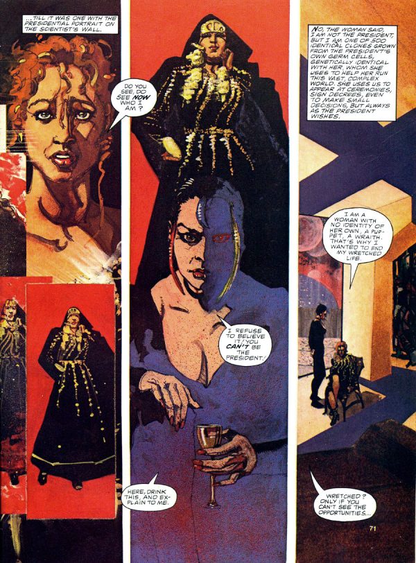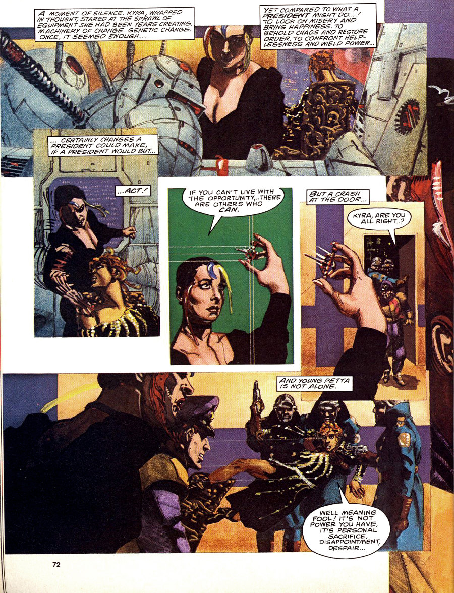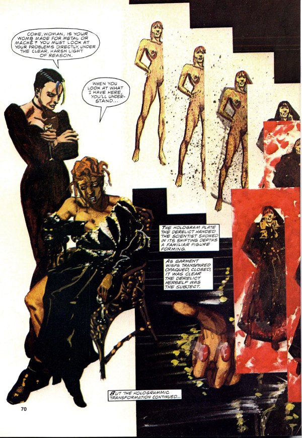 “To me,” wrote the artist, again in Moebius 0, “‘adult’ means to be free in spirit, to know no bounds, to accept no moral restrictions, especially those imposed by somebody else.” The Airtight Garage embodied this philosophy, fusing together images from all over the artist’s still-young career in breakneck fashion, its latter-day colors again providing some isolating effect, though here as representative of not youth but adult triumph, of the confident secrets adults can hold while entering unfamiliar terrain, or even while stepping away from the drawing board as the ‘real’ world reasserts itself. This was the character of the artist’s ‘adult’ comics, at their best.