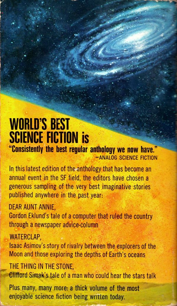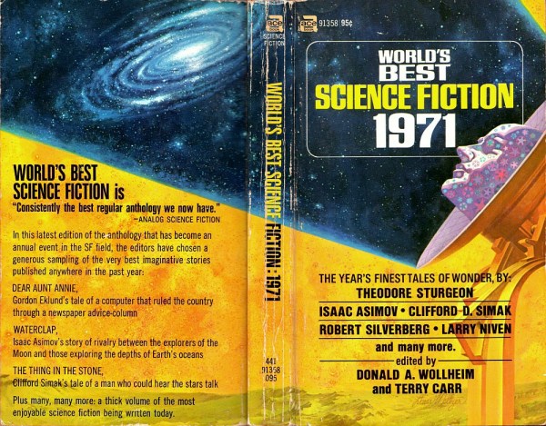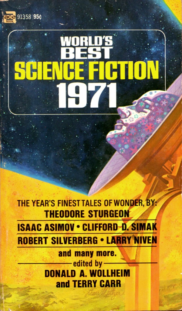 ABOVE: Donald A. Wollheim and Terry Carr, eds., World’s Best Science Fiction 1971 (NY: Ace, c1971), with cover art by Davis Meltzer.