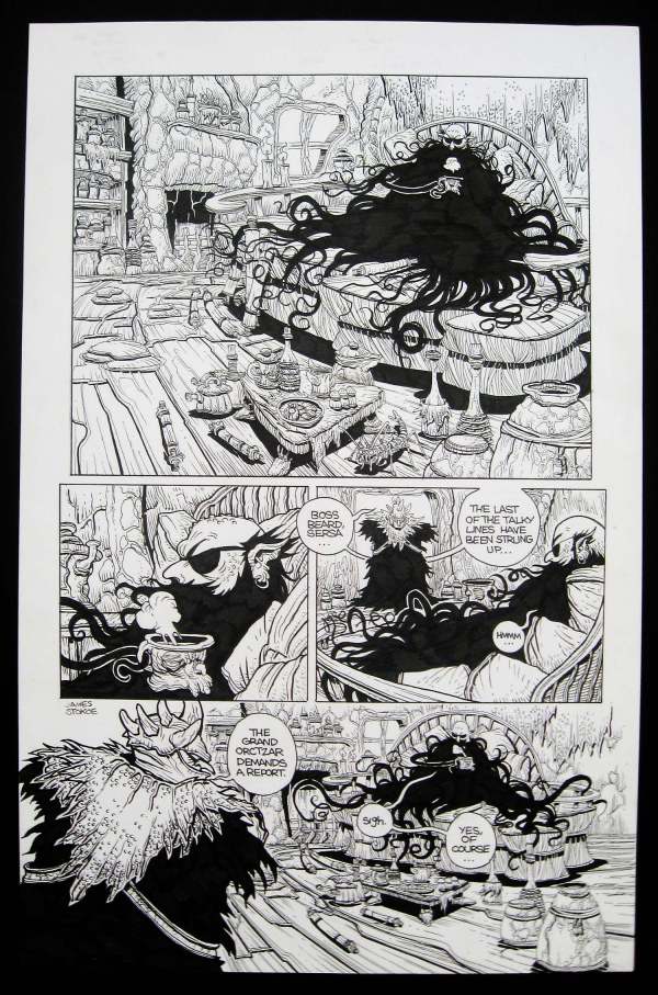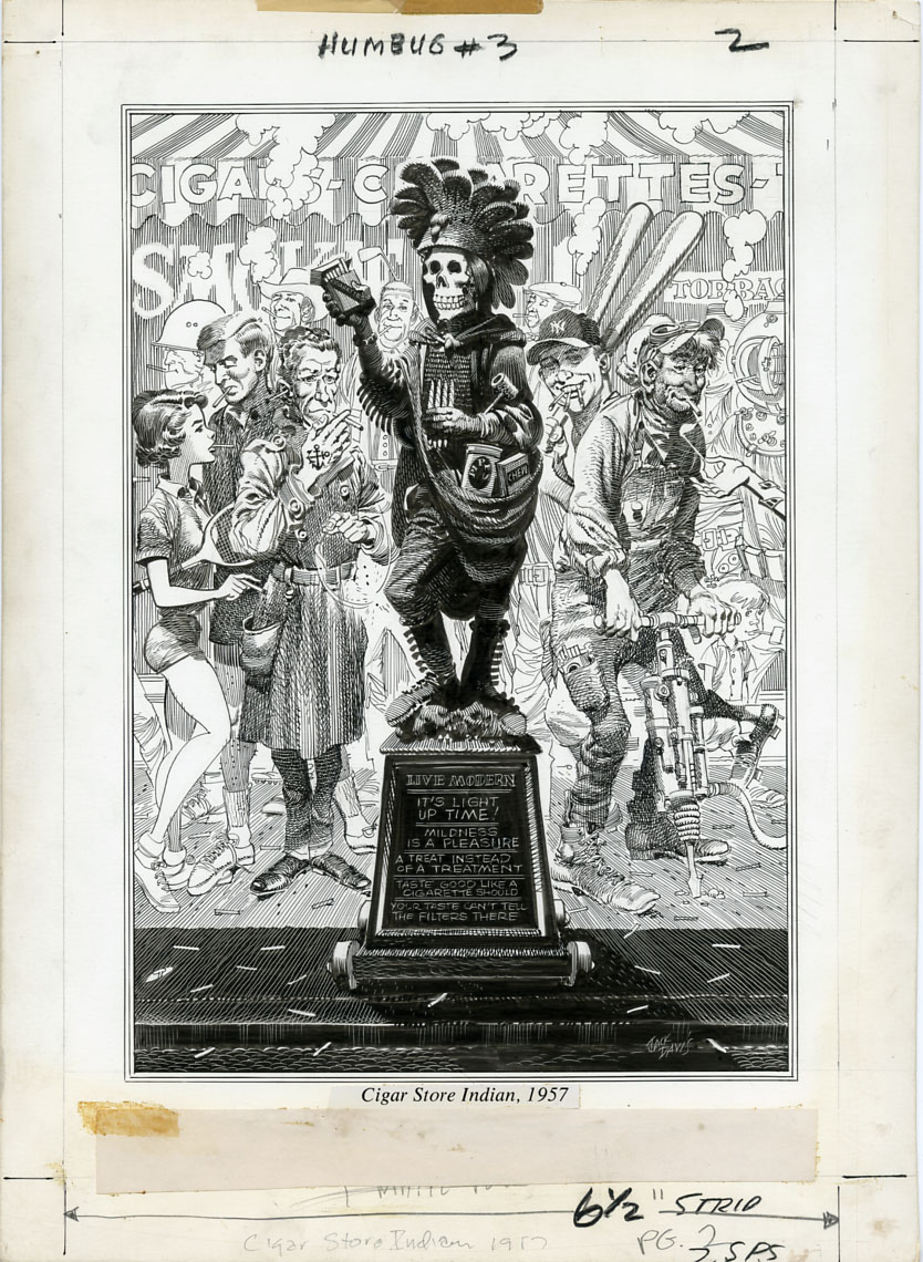 Here’s a JPEG of Jack Davis’s original artwork for “Cigar Store Indian, 1957” (with the note “HUMBUG #3” at the top), along with a scan of the piece as it was printed in Humbug #4: