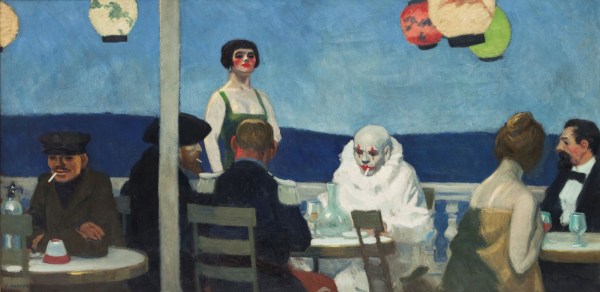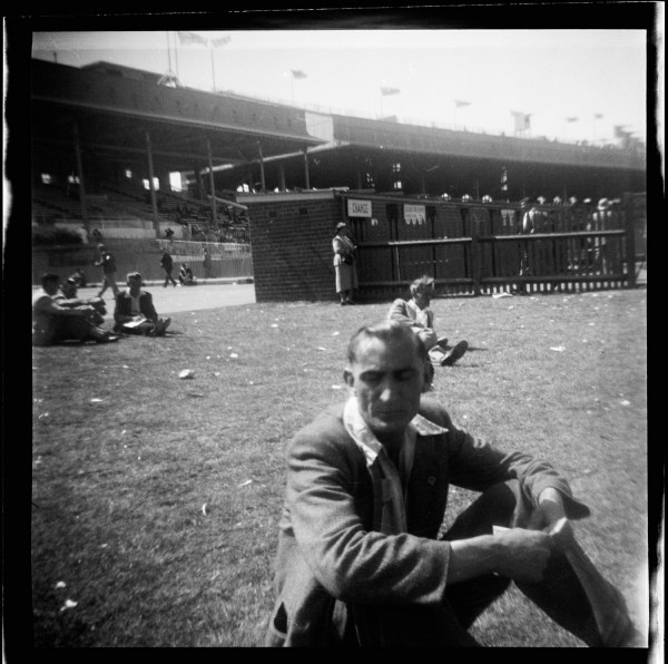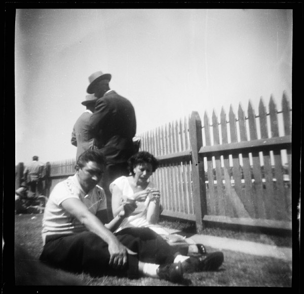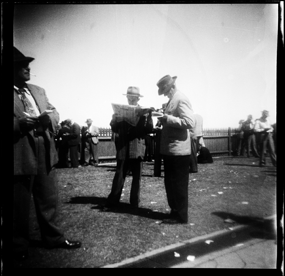 Think they’re boring… scroll back slowly and think again… the tightly composed shot of the middle-aged men in hats, heads down, uncommunicative, one with his nose in a newspaper, the others either writing on or consulting folded pieces of paper — or are those racing forms? — a solemn assembly of punters, perhaps, each out for himself, preserved for posterity on a close-cropped stretch of lawn, with a picket fence marking the limits of their freedom, preventing them from wandering into the void beyond, I say, that snapshot, especially, conveys a Hopperesque feeling of human existential aloneness in a crowd that deepens the mystery of everyday life despite the fact that the effect is, almost certainly, entirely unintentional…