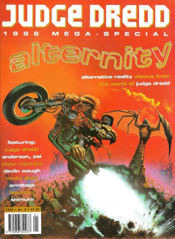 Corben’s cover art for the debut album by Meat Loaf and Jim Steinman, Bat Out of Hell, is explosive, iconic, classic. And since Bat Out of Hell is one of the best-selling albums of all time, I suspect that a great many people would recognize Jason Brashill’s cover to Judge Dredd 1996 Mega-Special as a homage to it. Still, I am delighted that the magazine’s editors acknowledged, on the indicia page, that the front cover art is “after MEATLOAF: Bat Out of Hell”; I am disappointed, however, that they didn’t see fit to mention Corben by name. Because technically speaking, it’s Corben’s art alone that Jason Brashill’s work is “after”; the typographical choices of the designer of the Bat Out of Hell cover have been completely ignored.