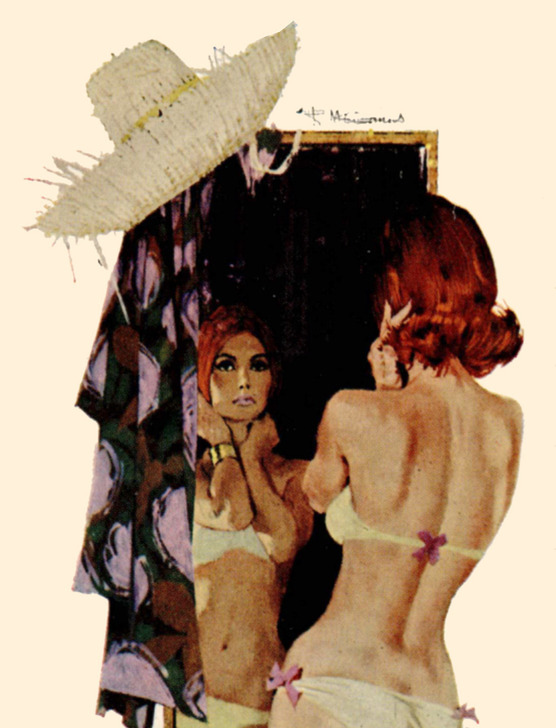 Take a close look at the full-page picture of the female movie star in the magazine that Norman Rockwell’s Girl at Mirror has in her lap. Now look at the reflection of the woman in Robert McGinnis’s painting for the Carter Brown novel, The Never-Was Girl; see how McGinnis’s model seems to be using her hands as a cover to test how she would look with her hair done up like Rockwell’s movie star; also, simply compare the two faces. Coincidence? I doubt it…