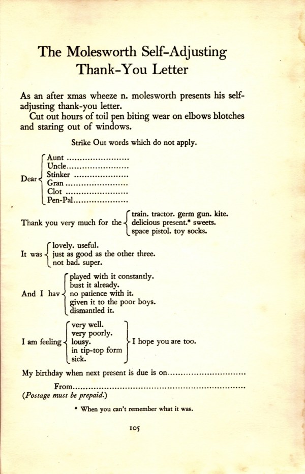 If you haven’t yet sent thank-you letters for the gifts you received at Christmas, Nigel Molesworth has a time-saving solution for your consideration: