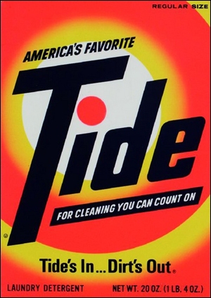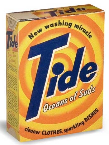 Donald Deskey designed the original Tide bullseye logo. Marc Getter designed the cover of the first American edition of Thomas Pynchon’s Gravity’s Rainbow, published in 1973. Dean Ellis illustrated the cover of the first edition of Samuel R. Delany’s Dhalgren, published in 1975. Paul McCarthy designed the case for his 2010 exhibition catalogue, Low Life Slow Life, to look like a Tide box, circa 1973.